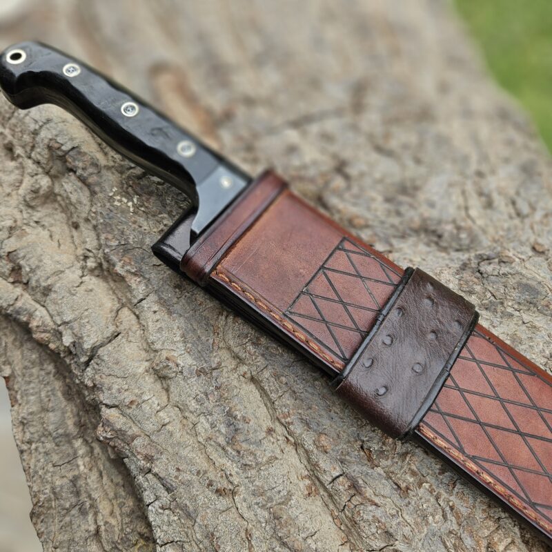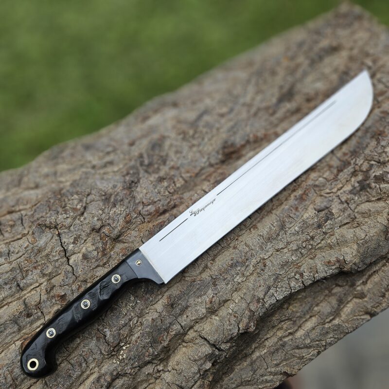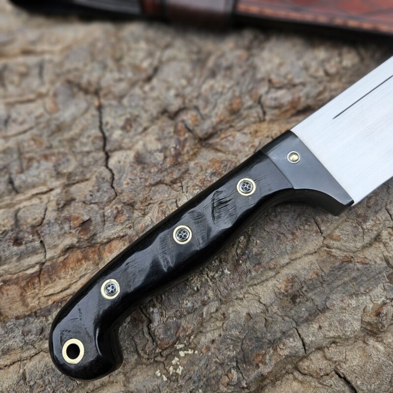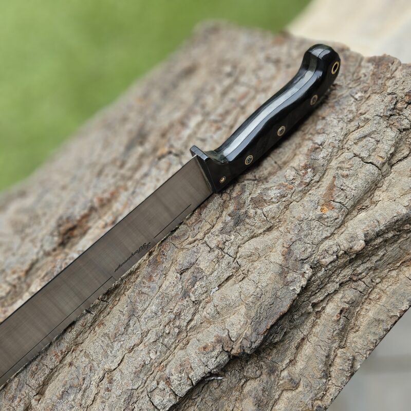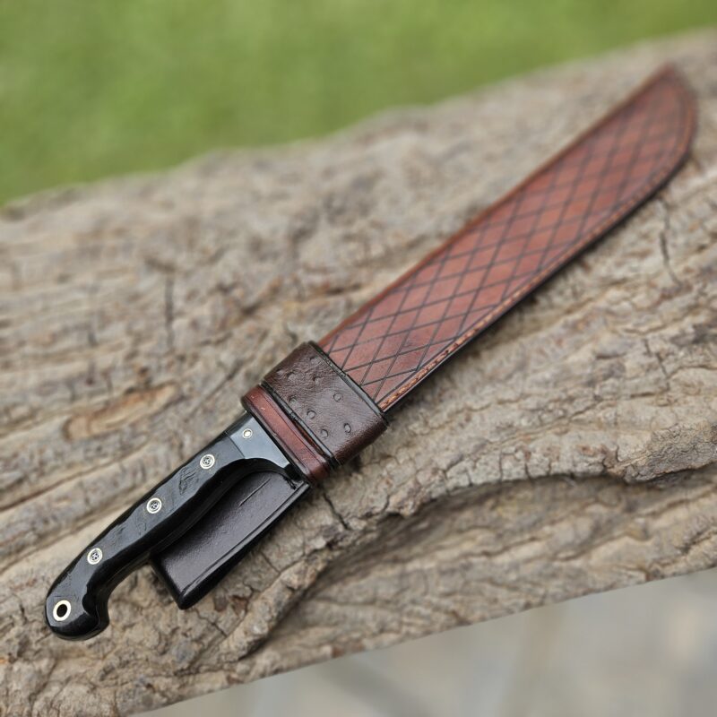 Cutelo de aço 5160. Dimensões : comprimento total = 35 cm; lâmina = 20 cm; largura máxima = 8 cm; espessura máxima = 6 mm; peso = 835 gramas. Empunhadura de jacarandá com pinos mosaico e bainha de couro bovino.