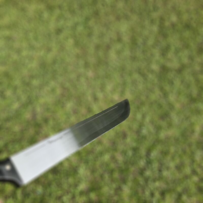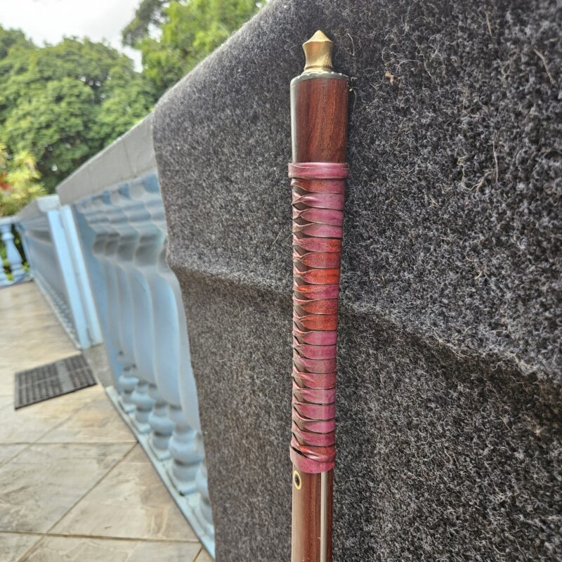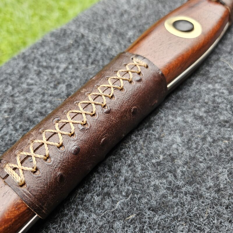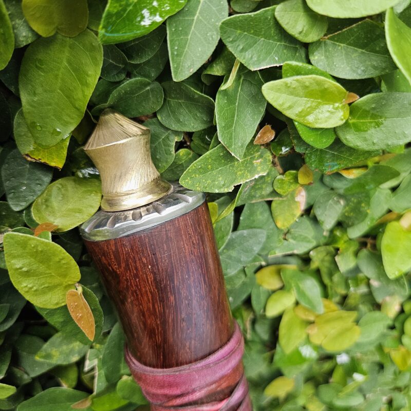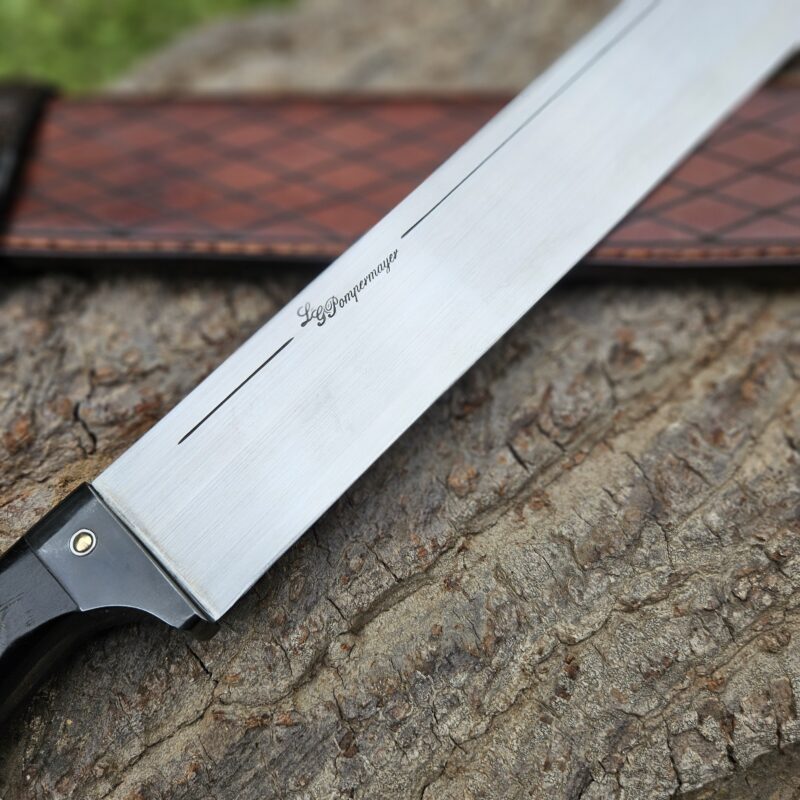 Cutelo de aço 5160. Dimensões : comprimento total = 35 cm; lâmina = 20 cm; largura máxima = 8 cm; espessura máxima = 6 mm; peso = 835 gramas. Empunhadura de jacarandá com pinos mosaico e bainha de couro bovino.