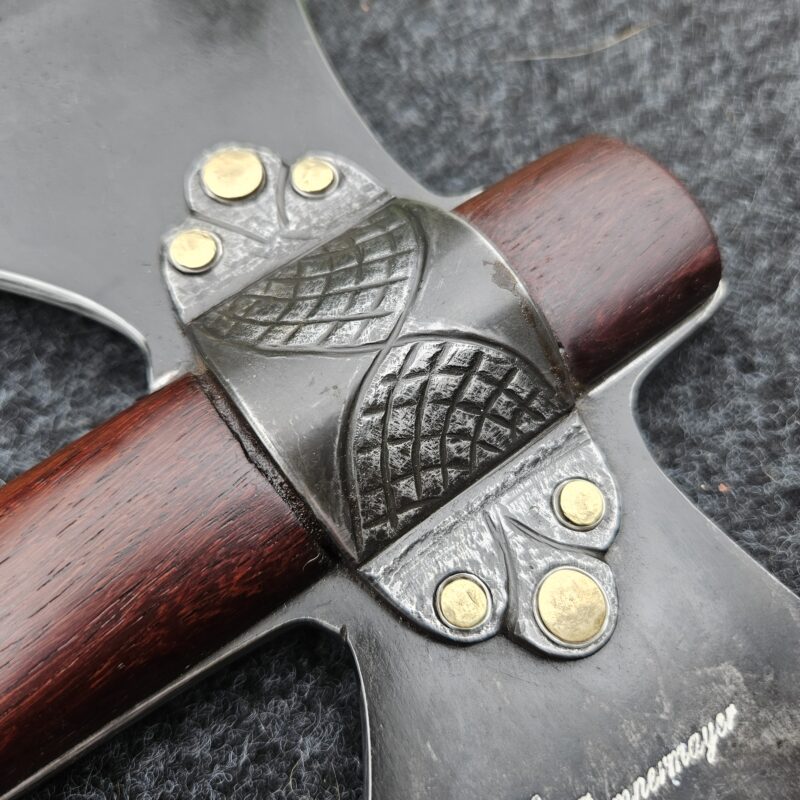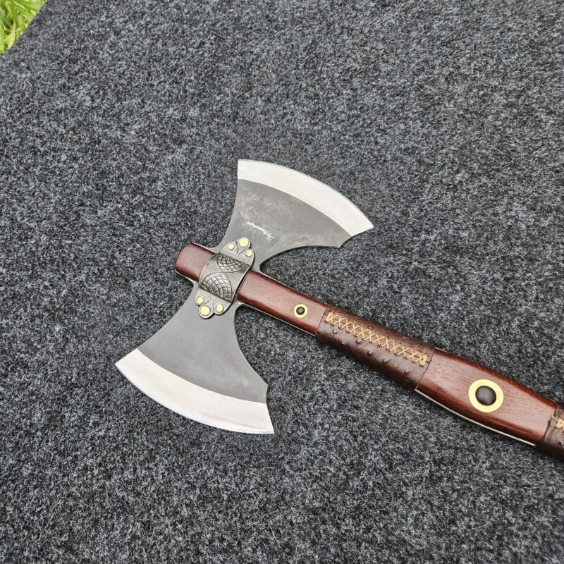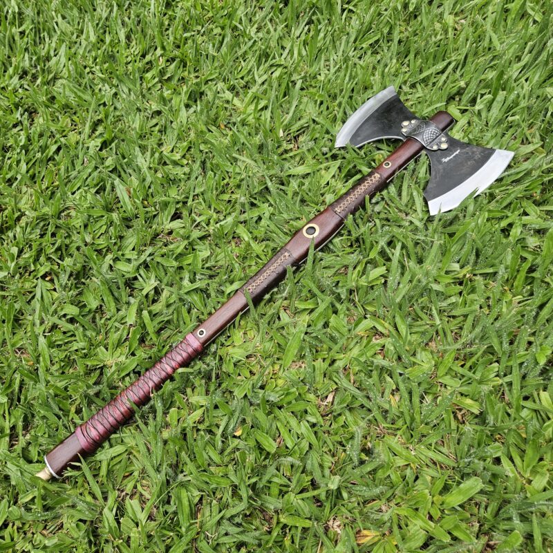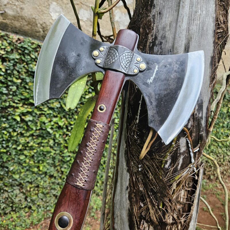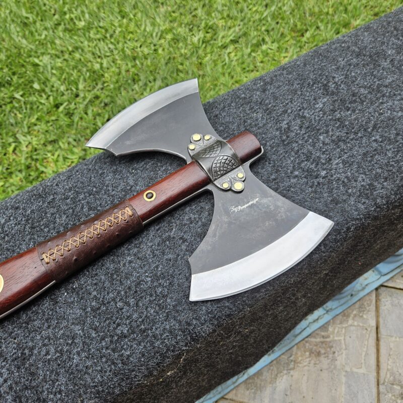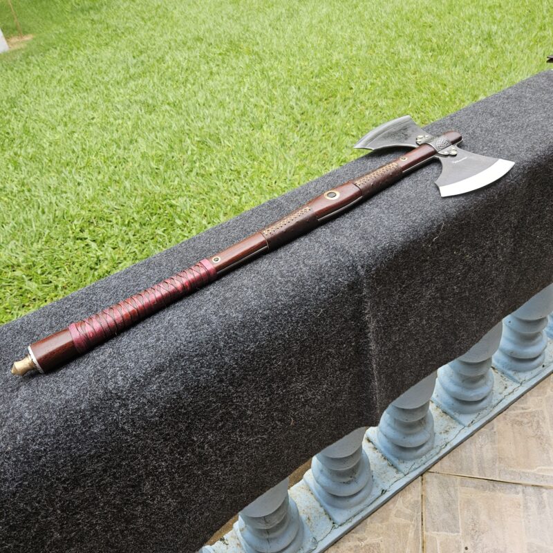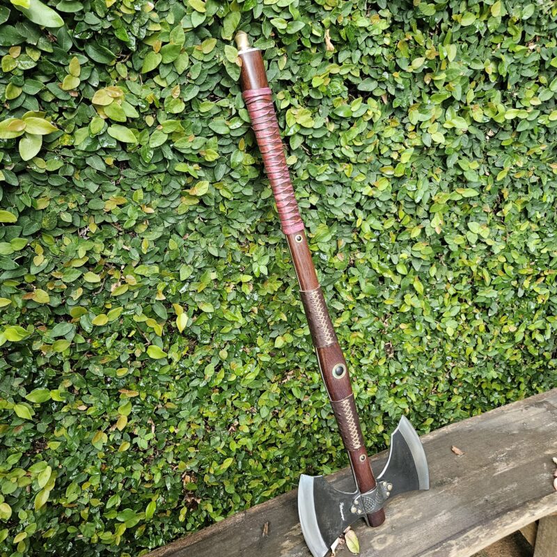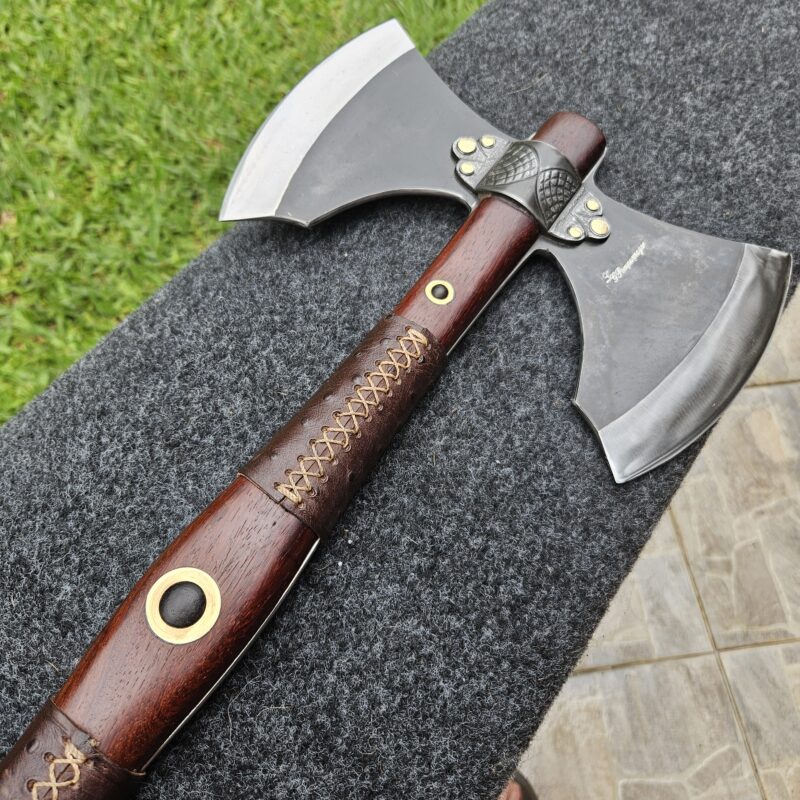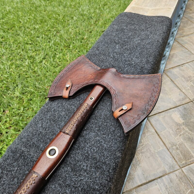 Machado Viking de aço carbono. Empunhadura de jacarandá do campo ornamentada com couro e pinos de latão. Olhal decorativo de aço carbono esculpido. Pomo de inox com quebra-crânio de bronze.