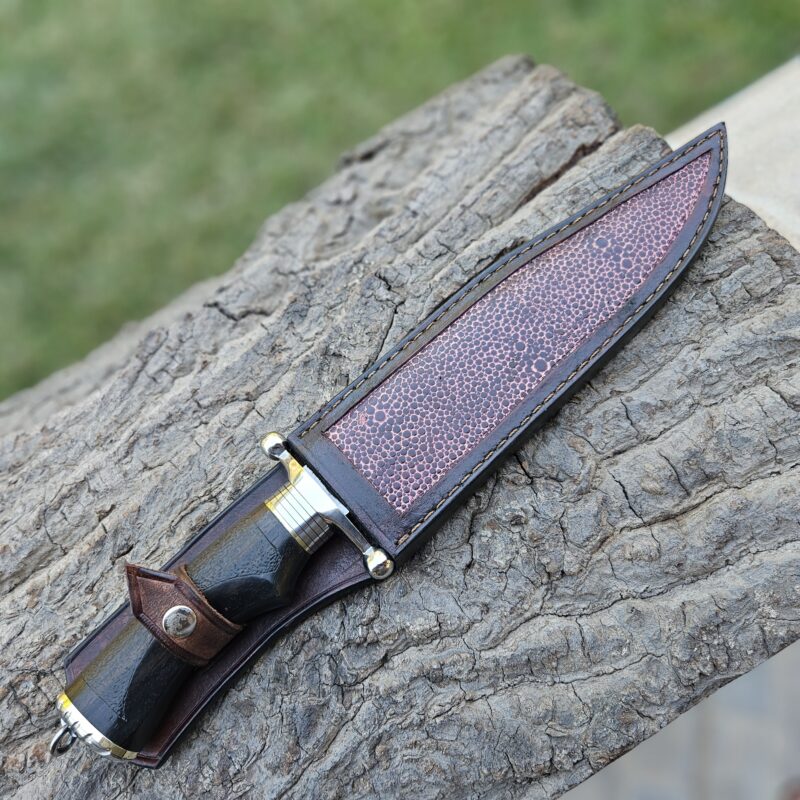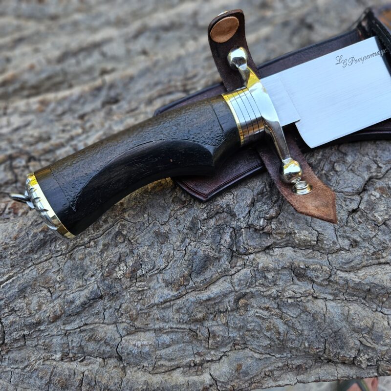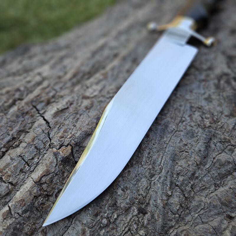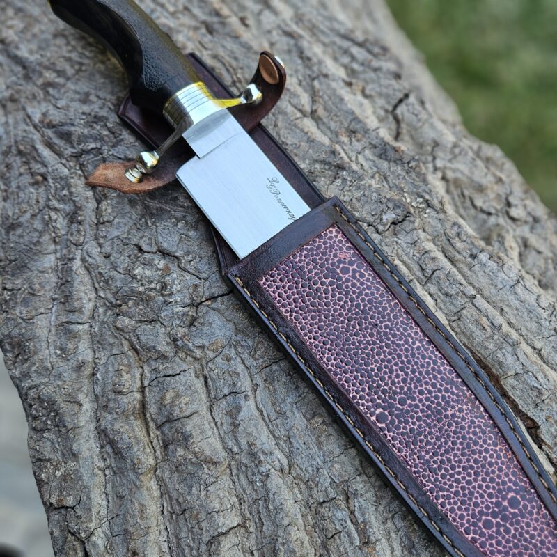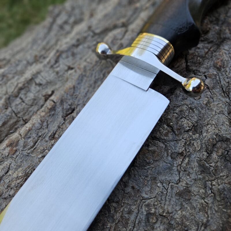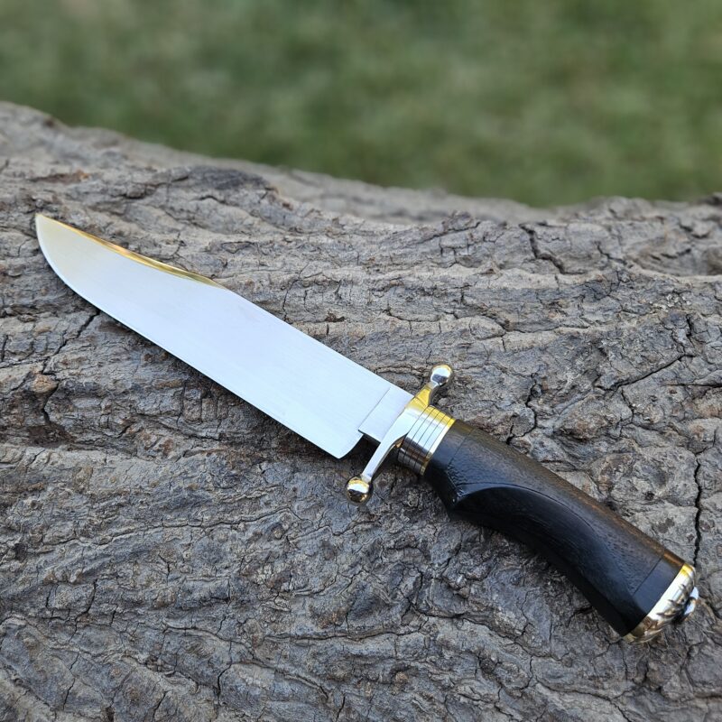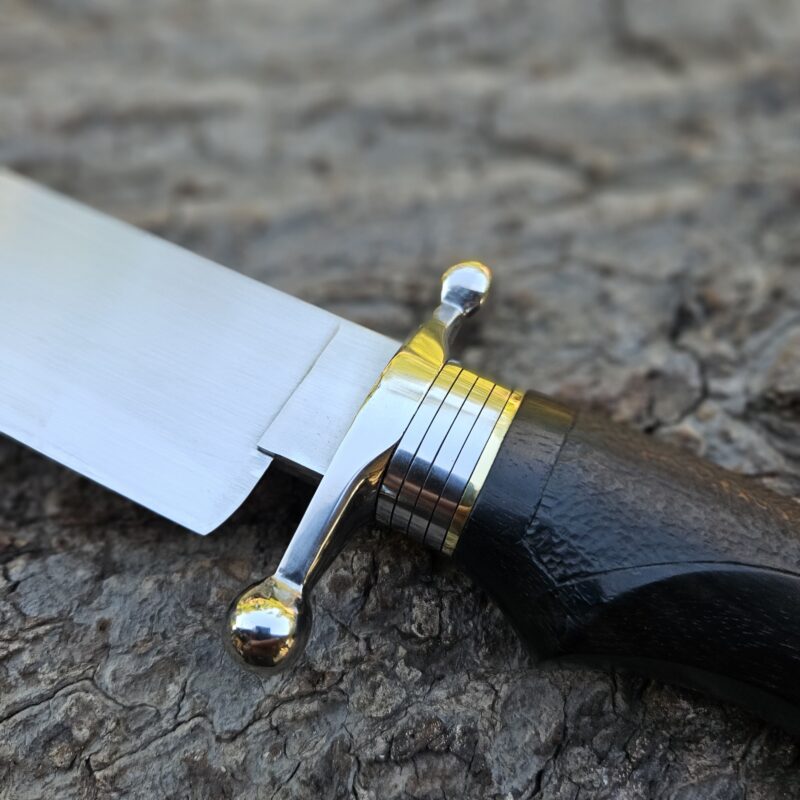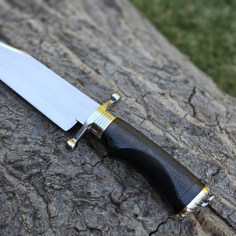 Faca Bowie, aço 5160. Dimensões: comprimento total = 39 cm; lâmina = 25 cm; largura máxima = 4,8 cm; espessura = 5 mm. Têmpera seletiva. Empunhadura de ébano com guarda dupla, pomo em inox esculpido; passante no final da espiga. Bainha de couro.