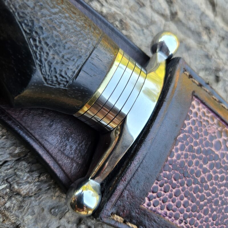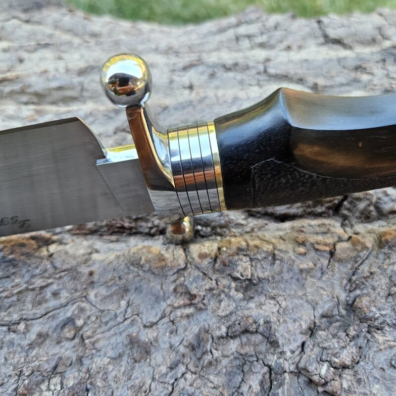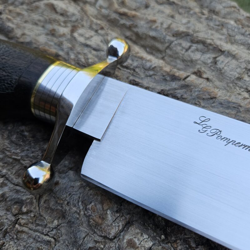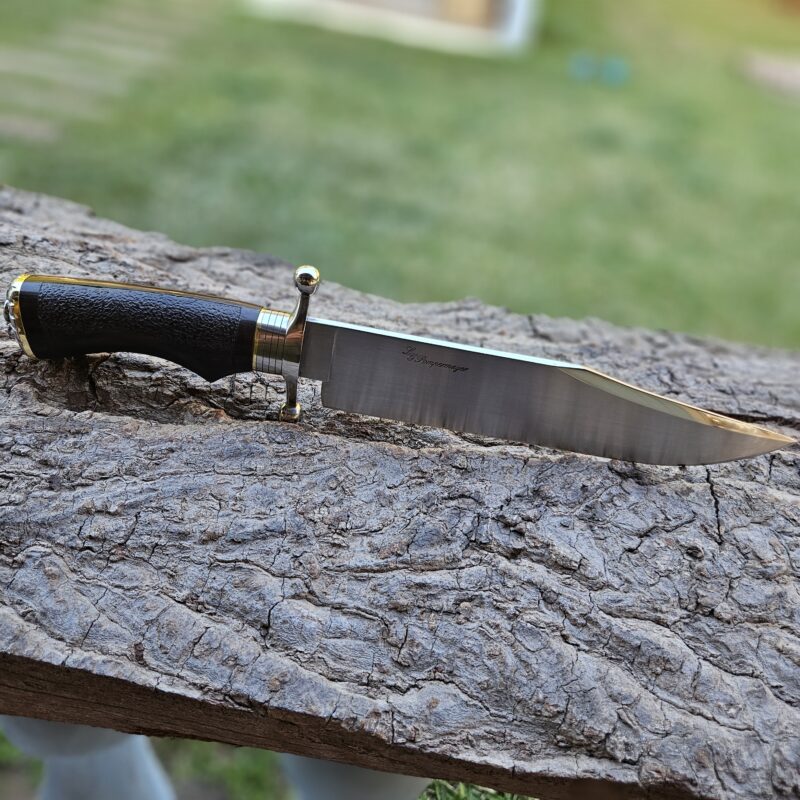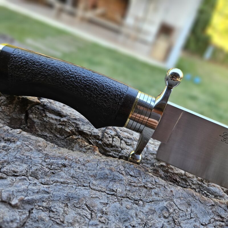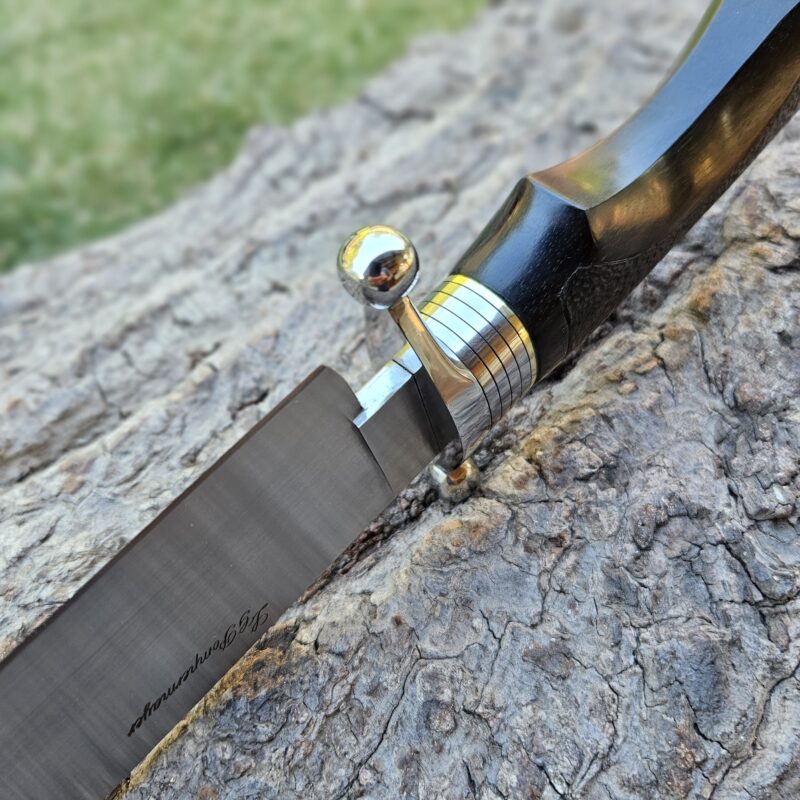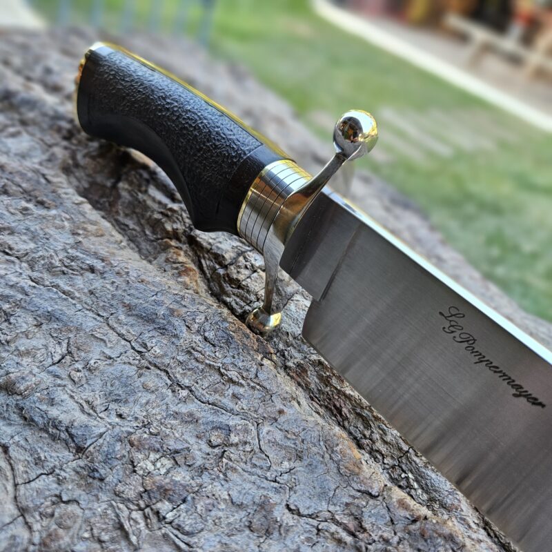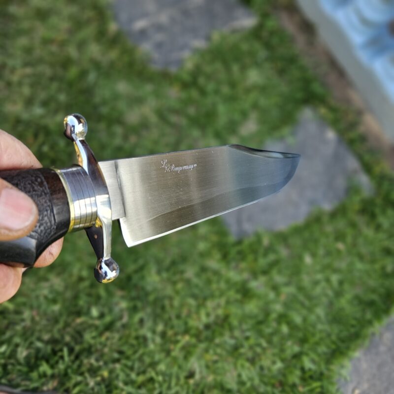 Faca Bowie, aço 5160. Dimensões: comprimento total = 39 cm; lâmina = 25 cm; largura máxima = 4,8 cm; espessura = 5 mm. Têmpera seletiva. Empunhadura de ébano com guarda dupla, pomo em inox esculpido; passante no final da espiga. Bainha de couro.