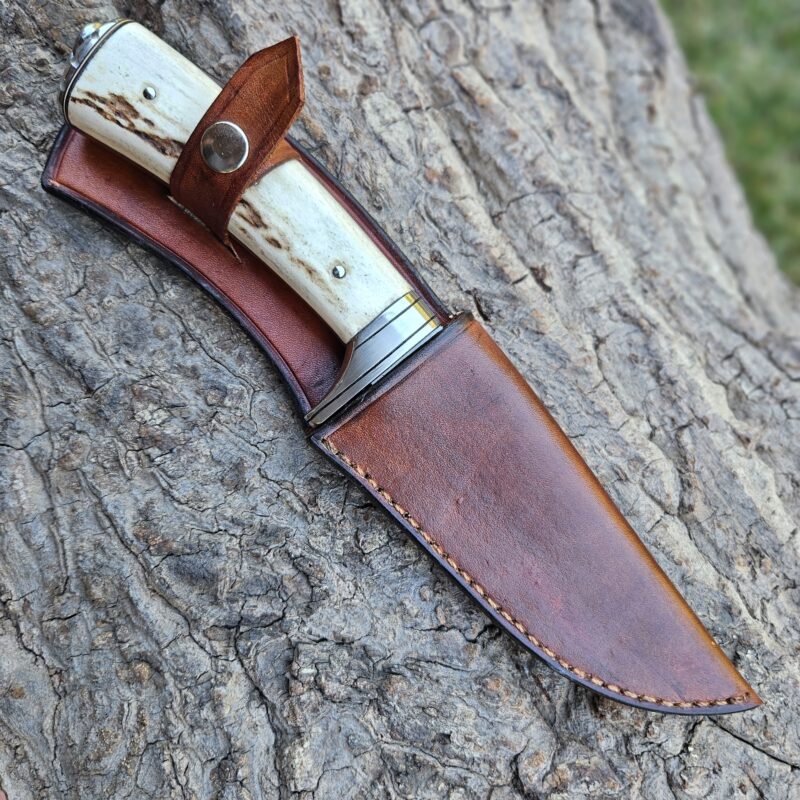 Faca Bowie, aço 5160. Dimensões: Comprimento total = 38 cm; lâmina = 26 cm; largura máxima = 5 cm; espessura = 5 mm. Empunhadura de chifre de cervo axis; guarda e pomo de aço inox 420 com argola passa-fiel na ponta da espiga ; calços de inox, celeron e fórmica. Bainha de couro bovino.
