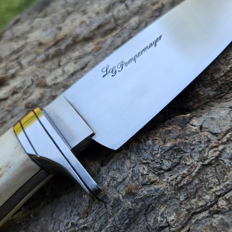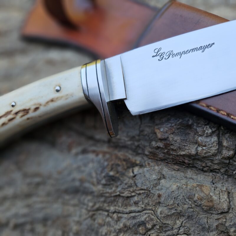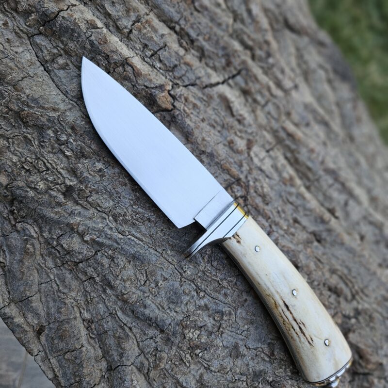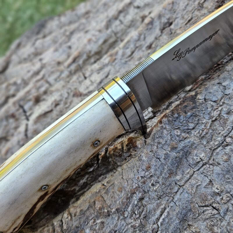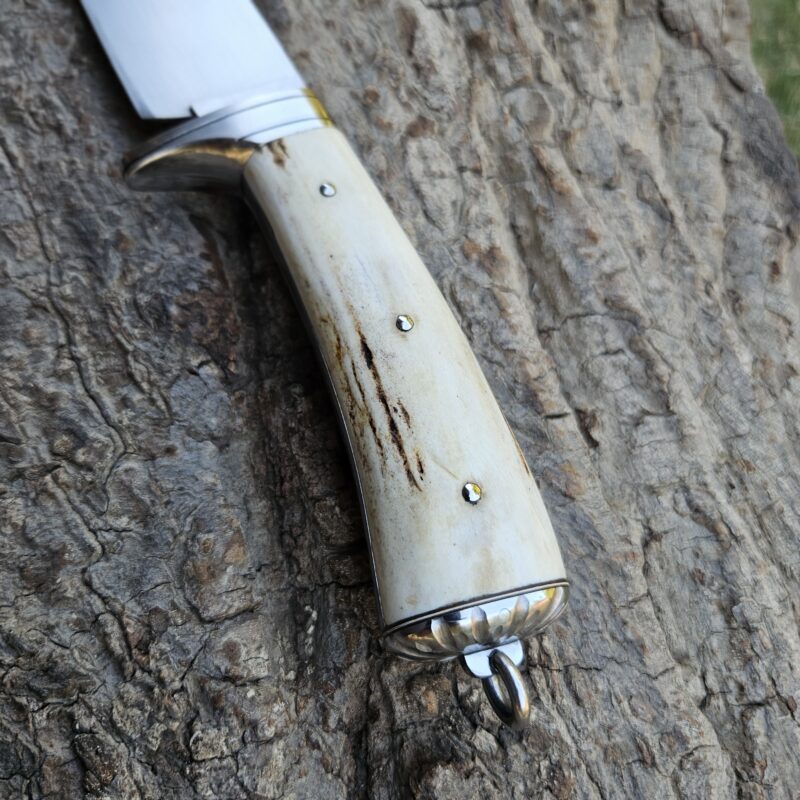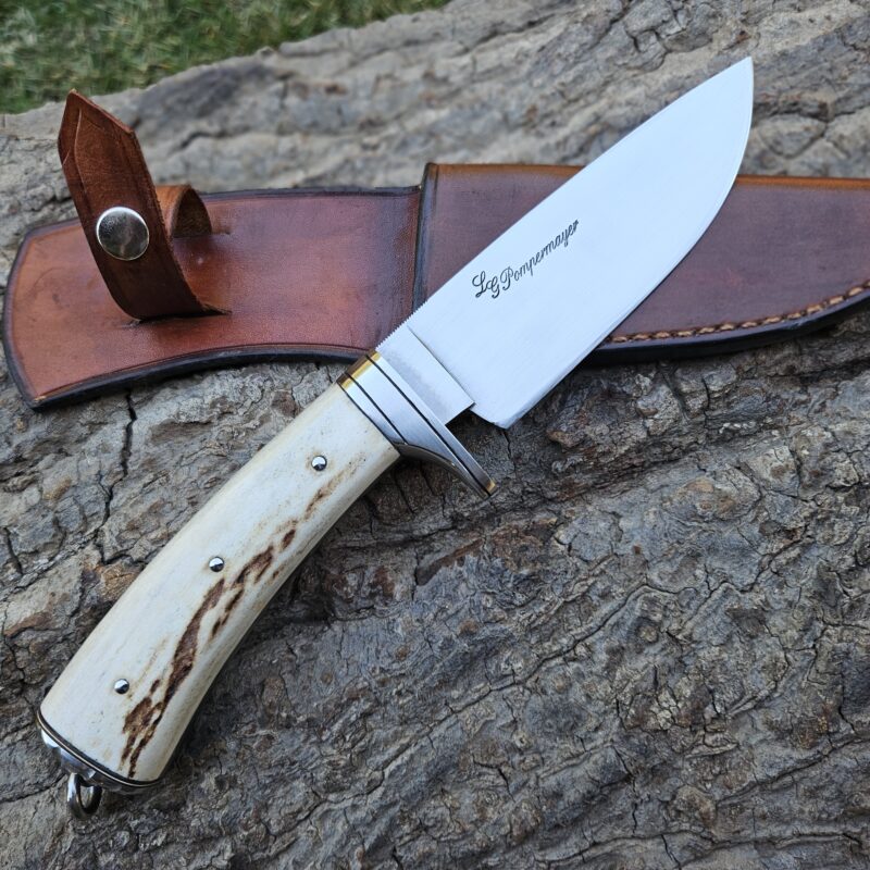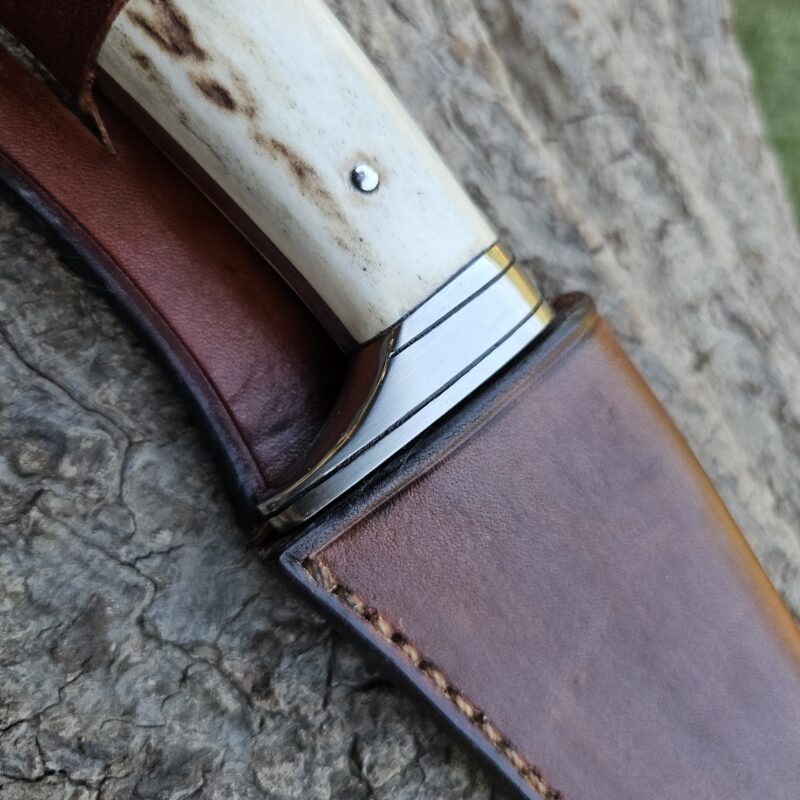 Faca de caça, aço inox N 690. Dimensões: comprimento total = 25 cm; lâmina = 12,5 cm; largura = 4 cm; espessura = 5 mm. Empunhadura de chifre de cervo axis, guarda e pomo de inox , bainha de couro bovino tingido.