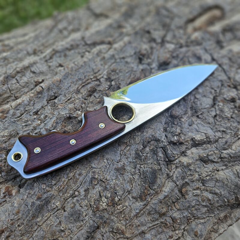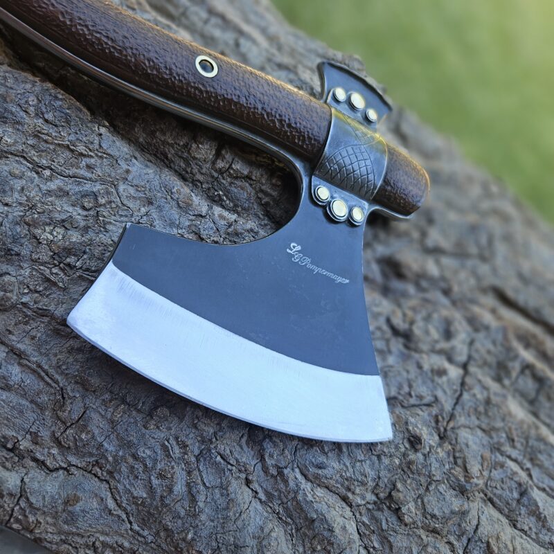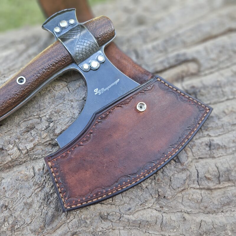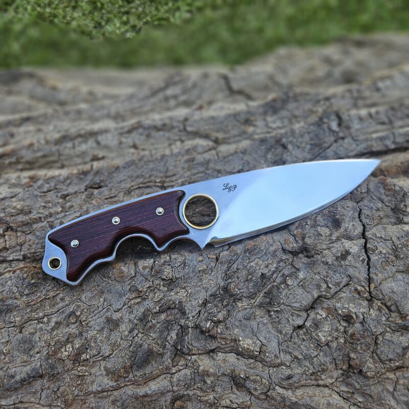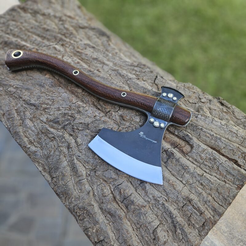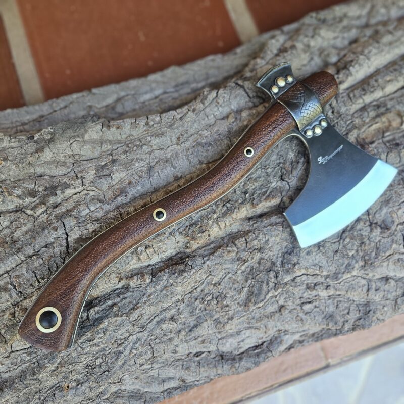 Machadinha integral de aço carbono fosfatizado. Dimensões: comprimento total = 40 cm; comprimento do fio de corte = 14 cm; peso = 1220 g. Empunhadura de jacarandá do campo com pinos de latão e ebano; olhal decorativo de aço carbono fosfatizado com pinos de inox e latão.