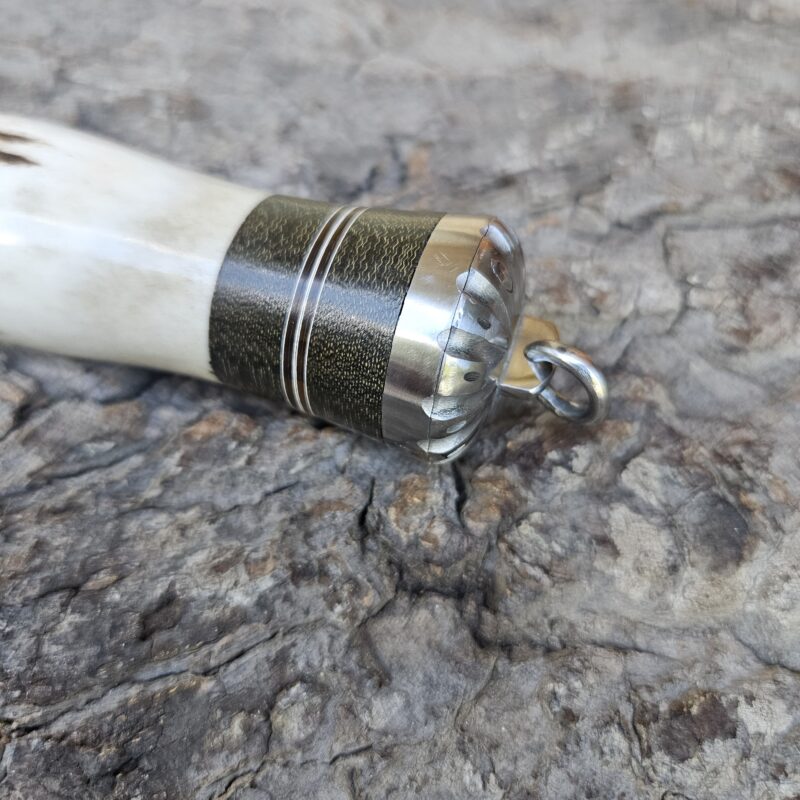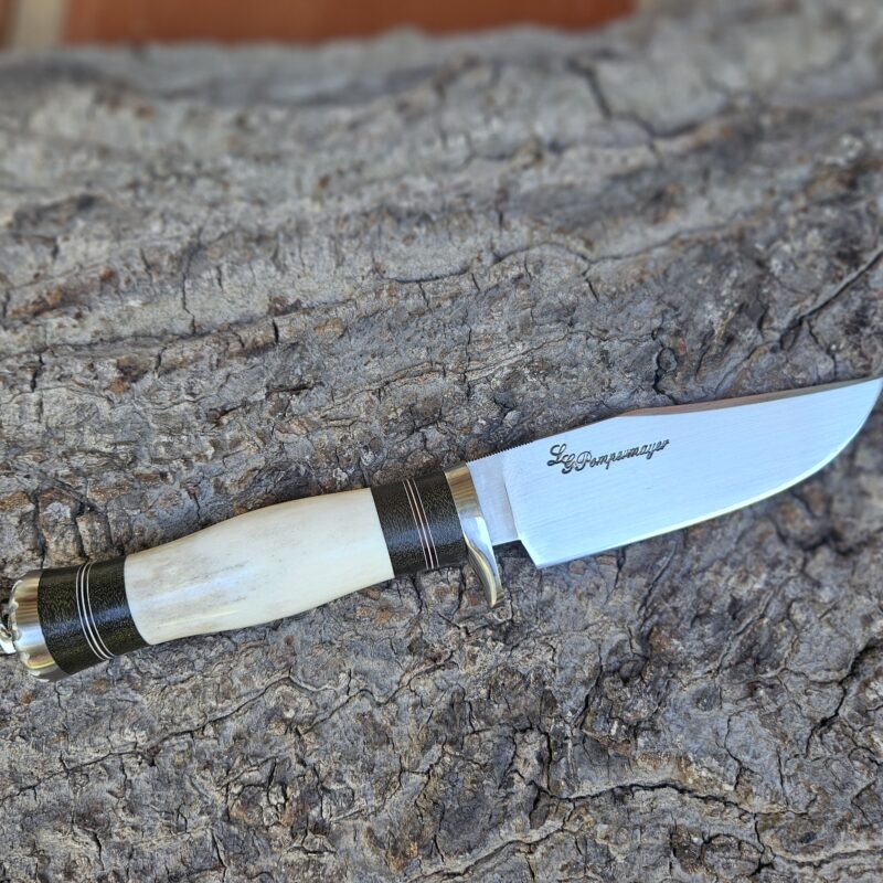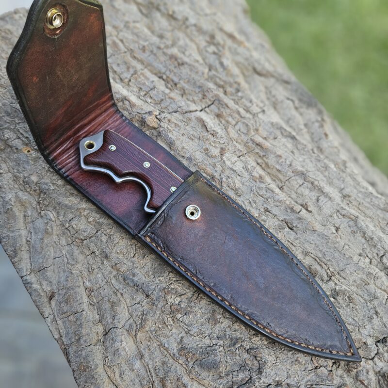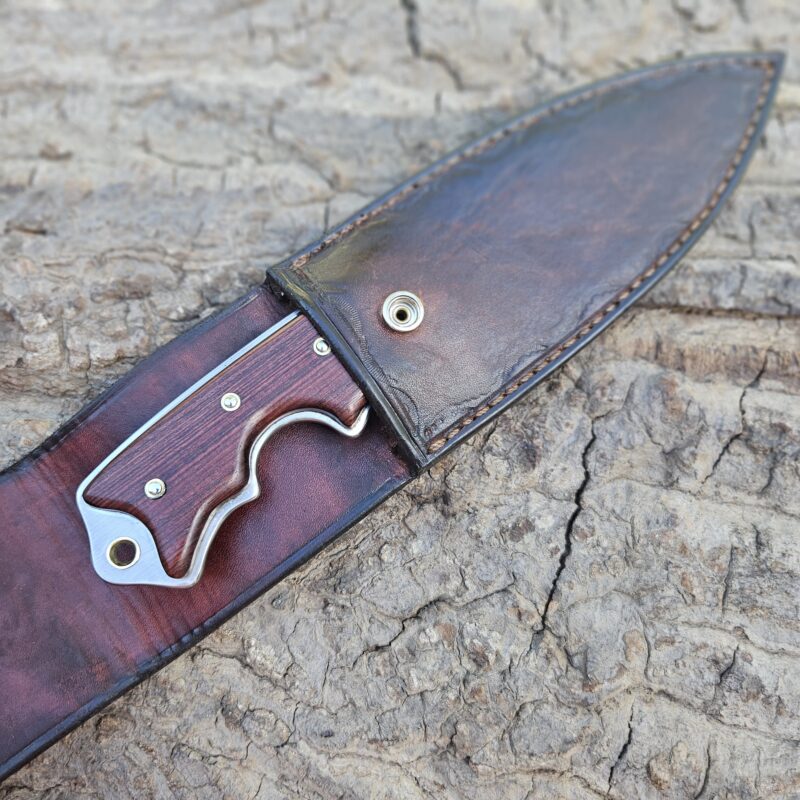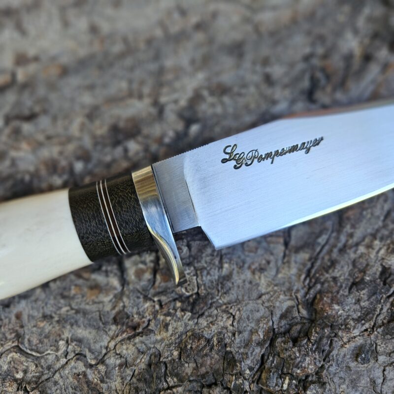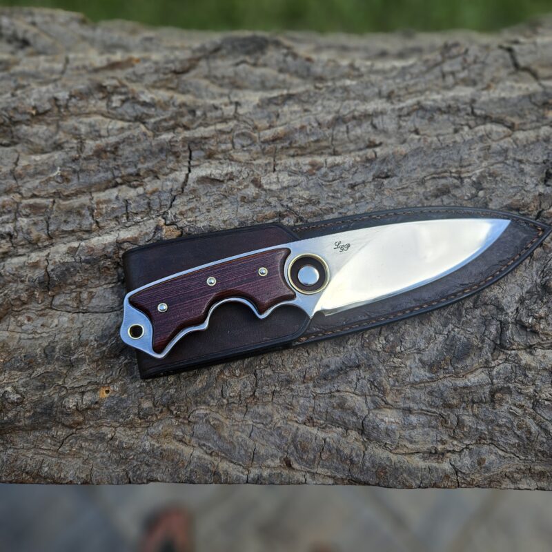 Machadinha integral de aço carbono fosfatizado. Dimensões: comprimento total = 40 cm; comprimento do fio de corte = 14 cm; peso = 1220 g. Empunhadura de jacarandá do campo com pinos de latão e ebano; olhal decorativo de aço carbono fosfatizado com pinos de inox e latão.