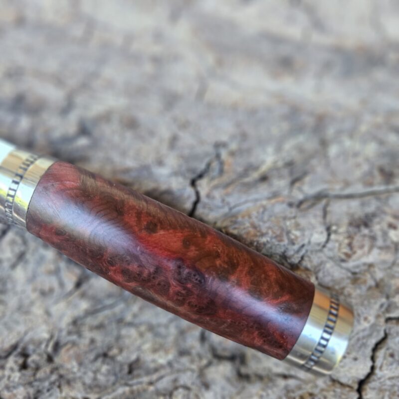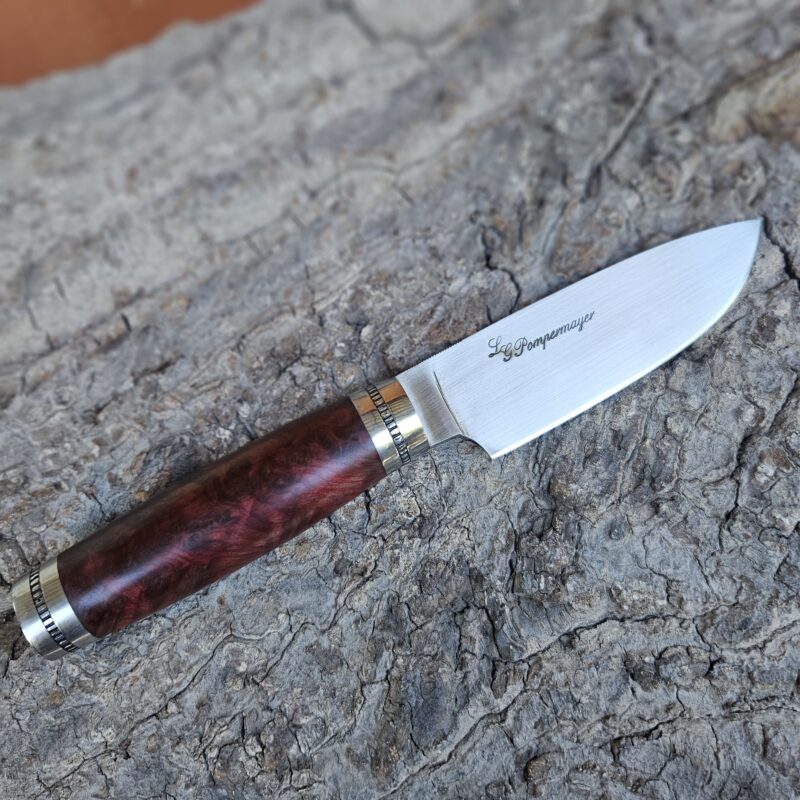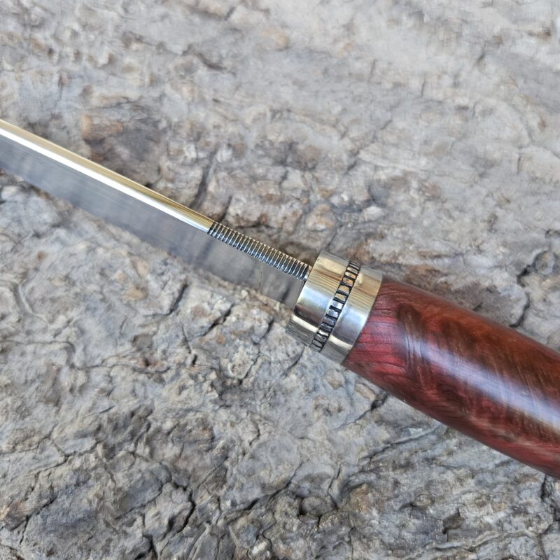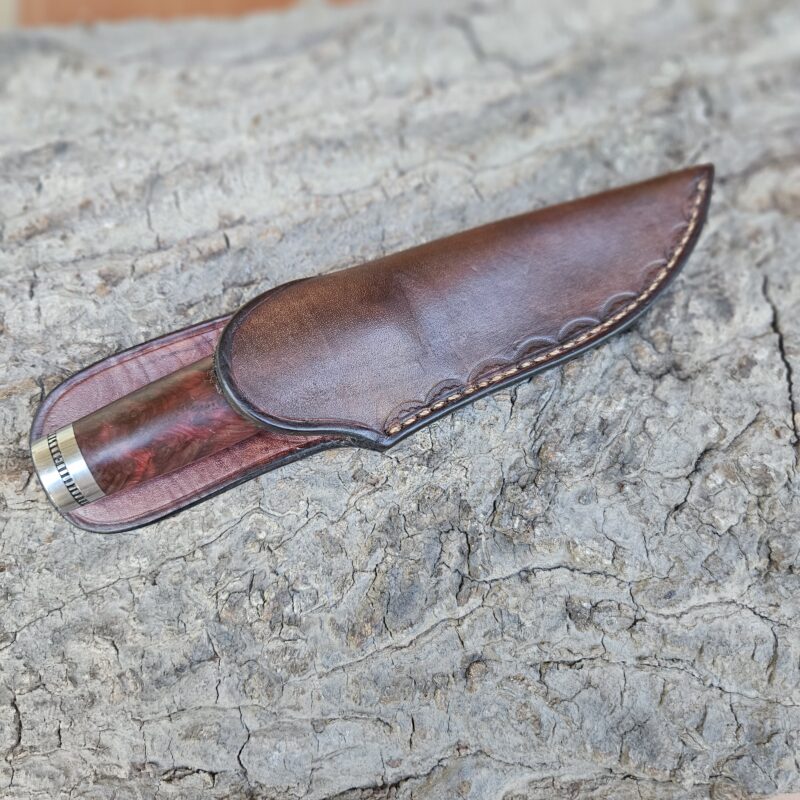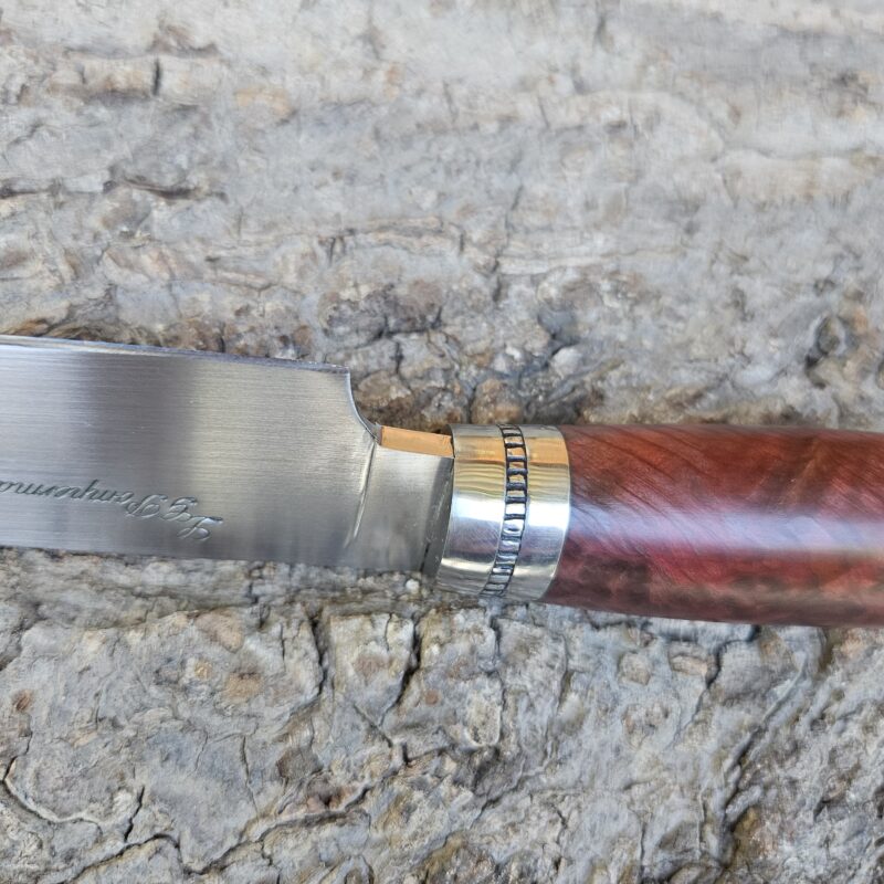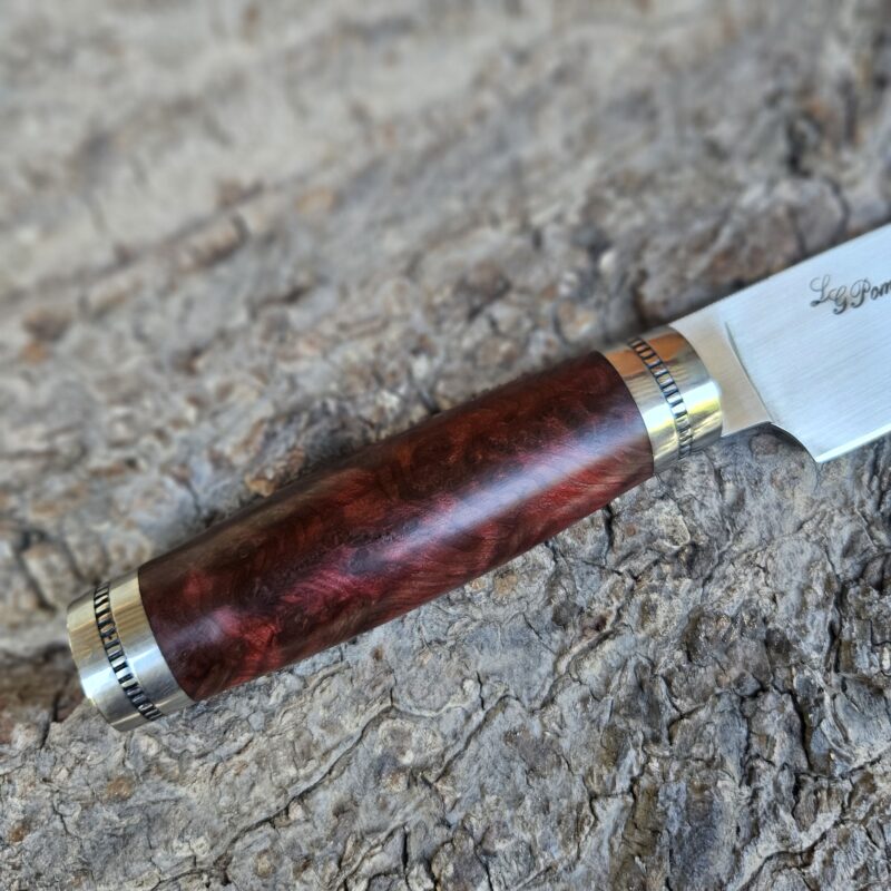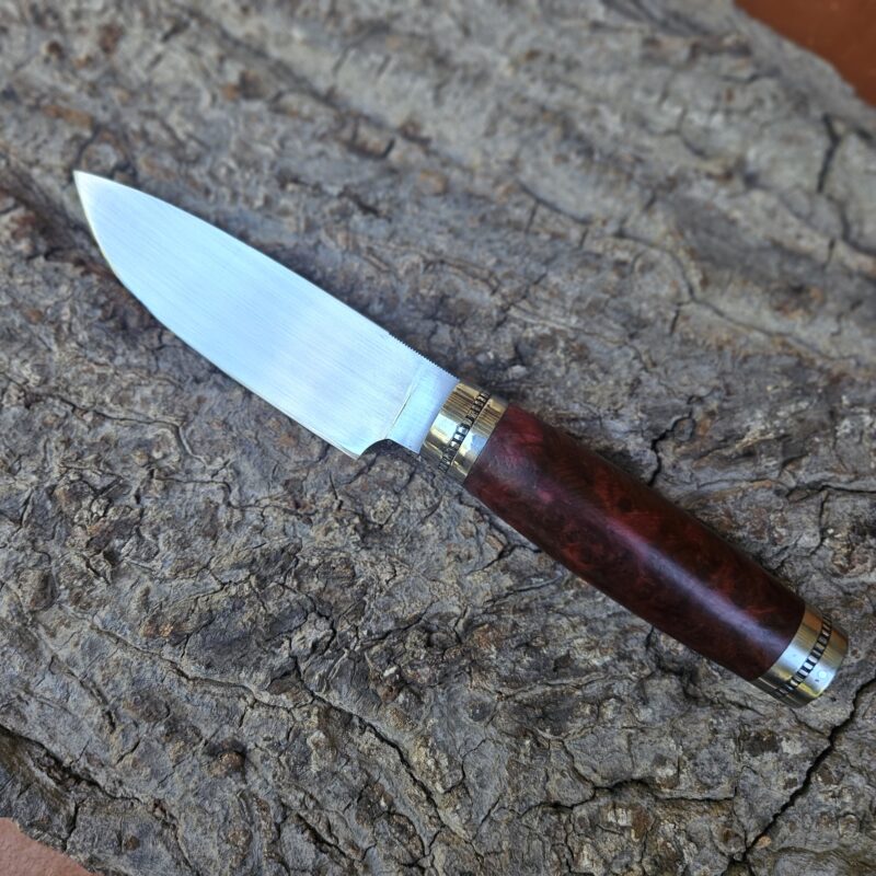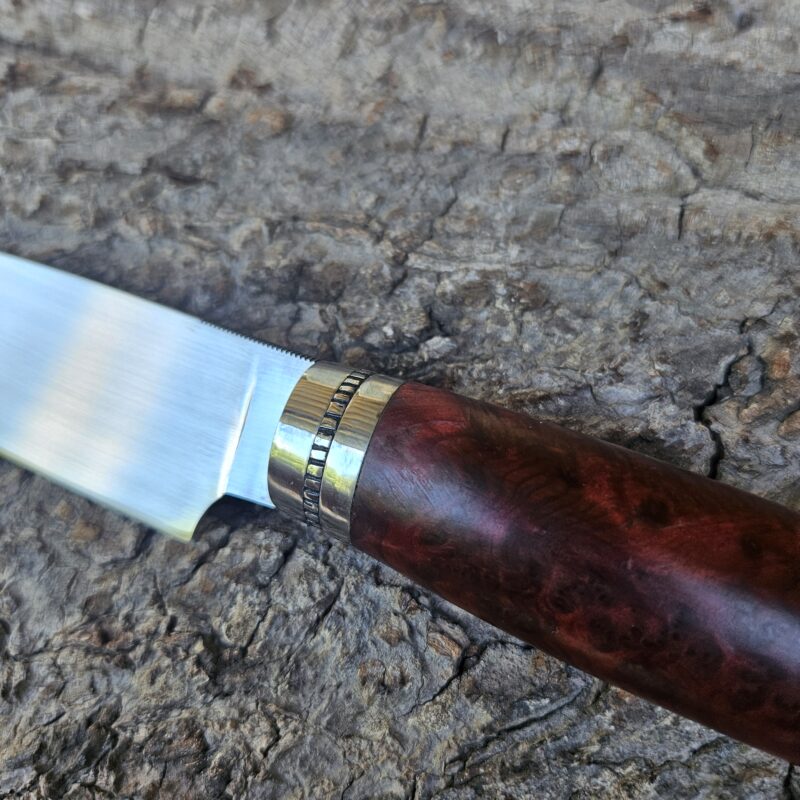 Faca utilitária, aço inox 14C 28N. Dimensões: comprimento total = 23 cm; lâmina = 12 cm; largura = 3,3 cm; espessura = 3 mm. Empunhadura de madeira estabilizada (redwood burl), colarinho e pomo de inox, bainha de couro bovino tingido.