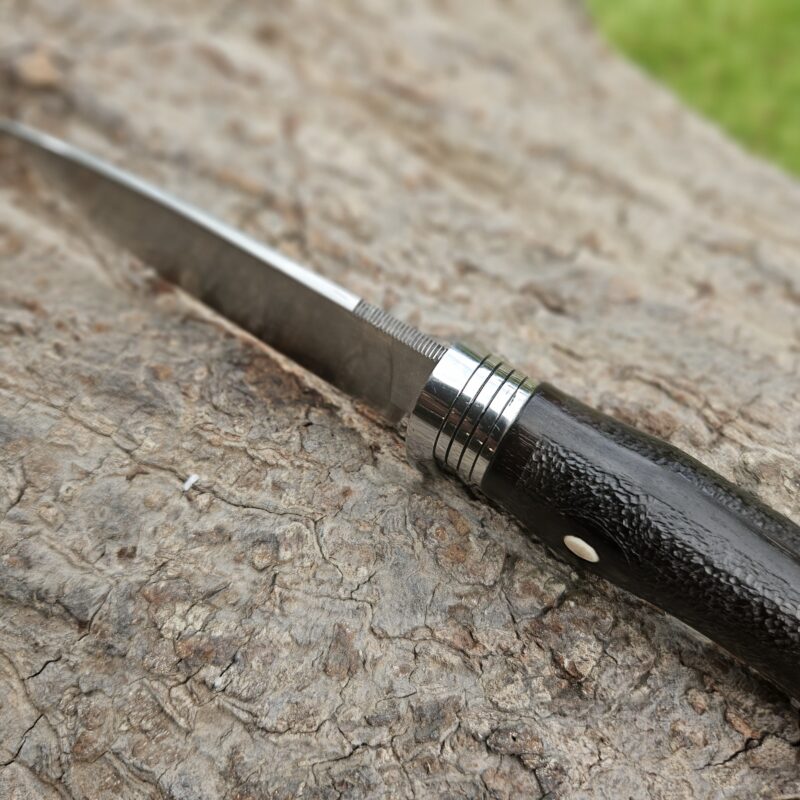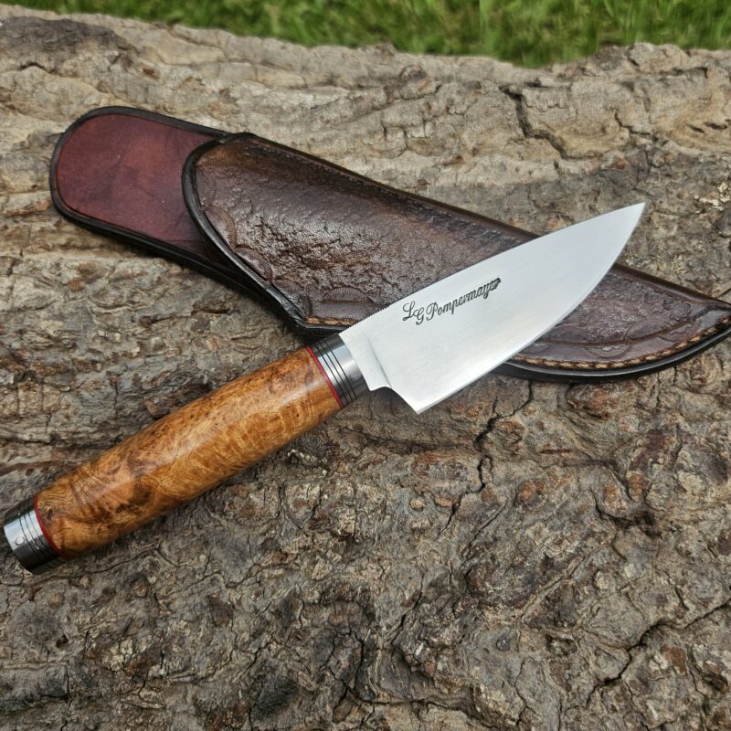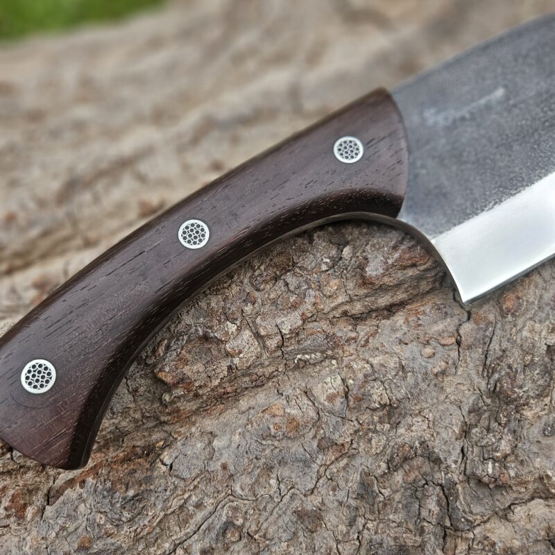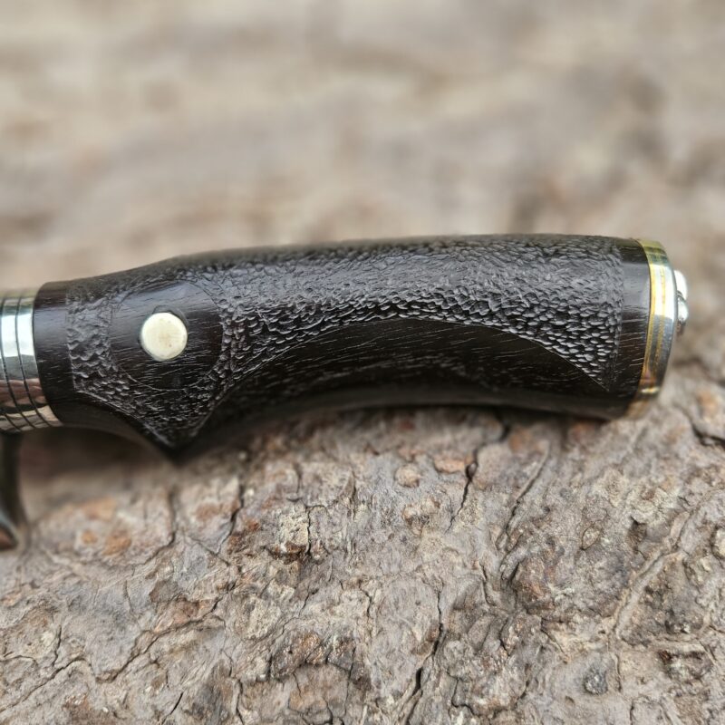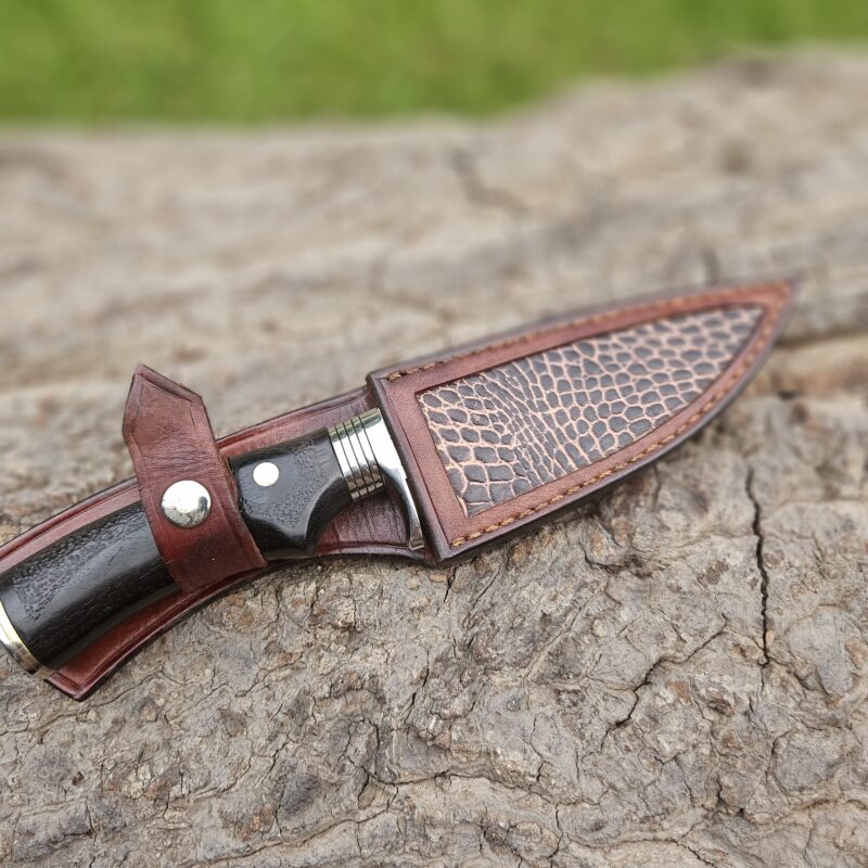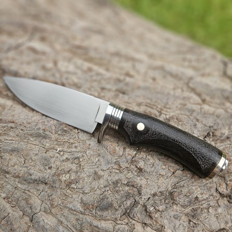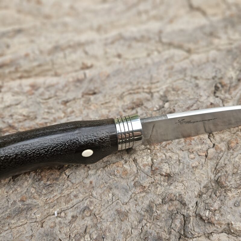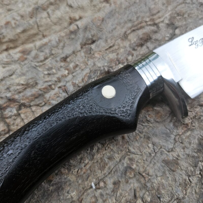 Faca de caça, aço inox 14C 28N. Dimensões: comprimento total = 25 cm; lâmina = 12,5 cm; largura = 3,5 cm; espessura = 4 mm. Empunhadura de ébano com inserto de chifre de cervo; guarda e pomo de inox com separadores de latão; passador de fiel na ponta da espiga; bainha de couro bovino tingido.