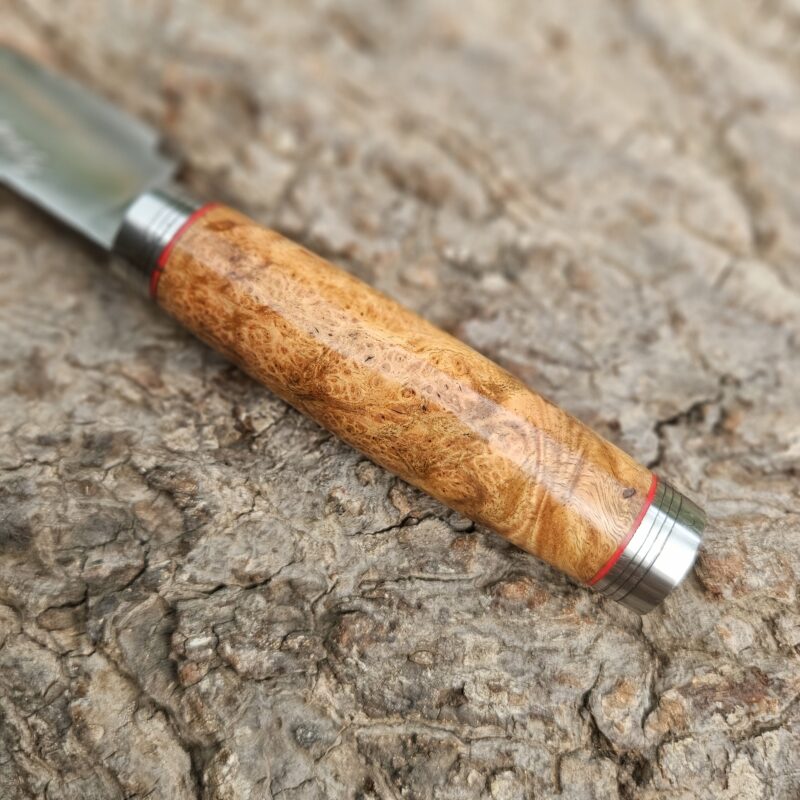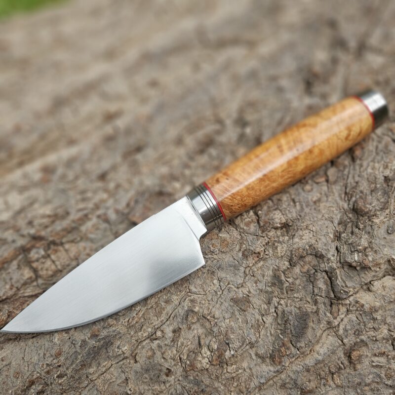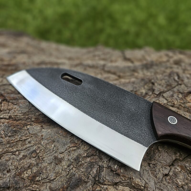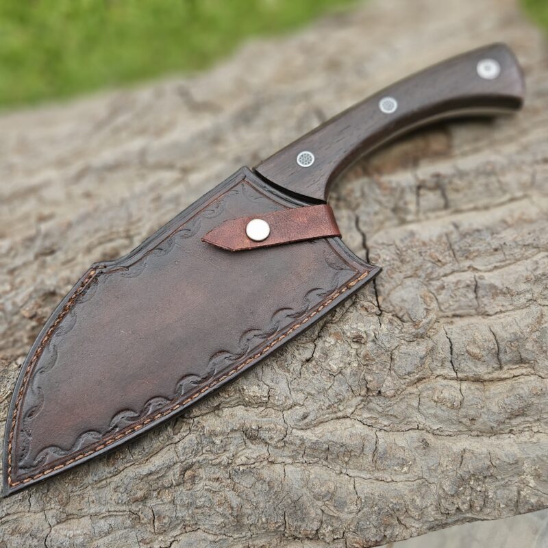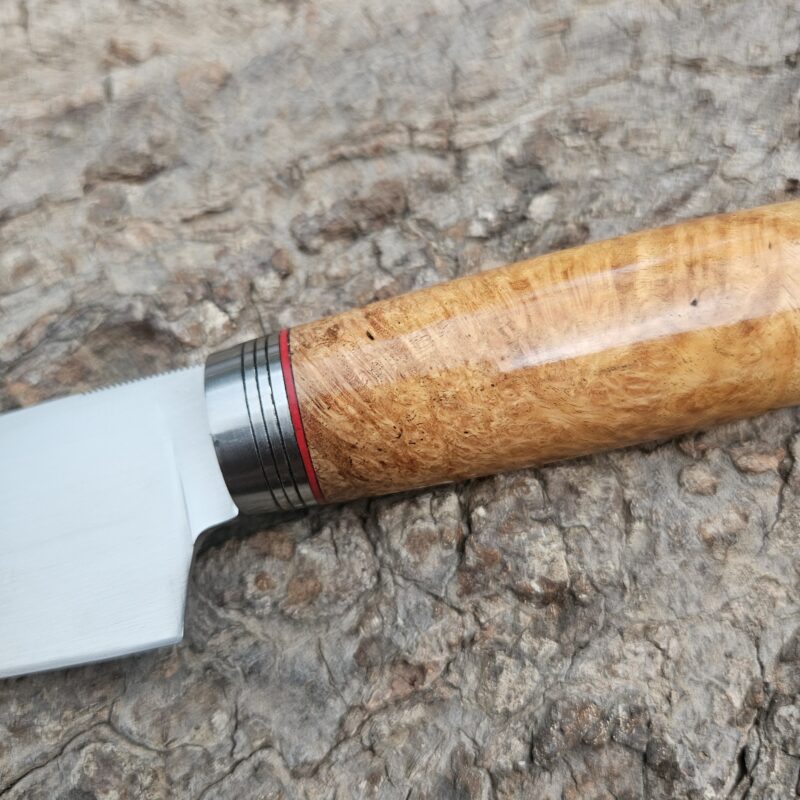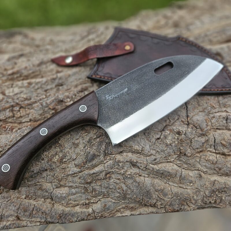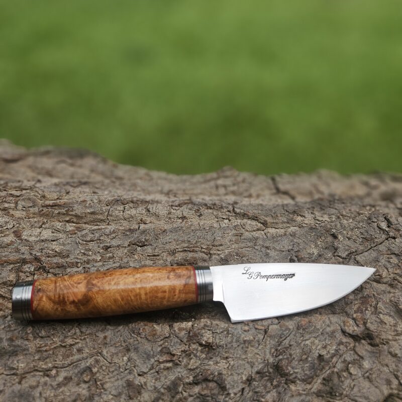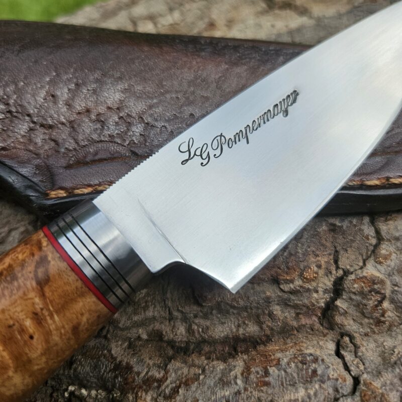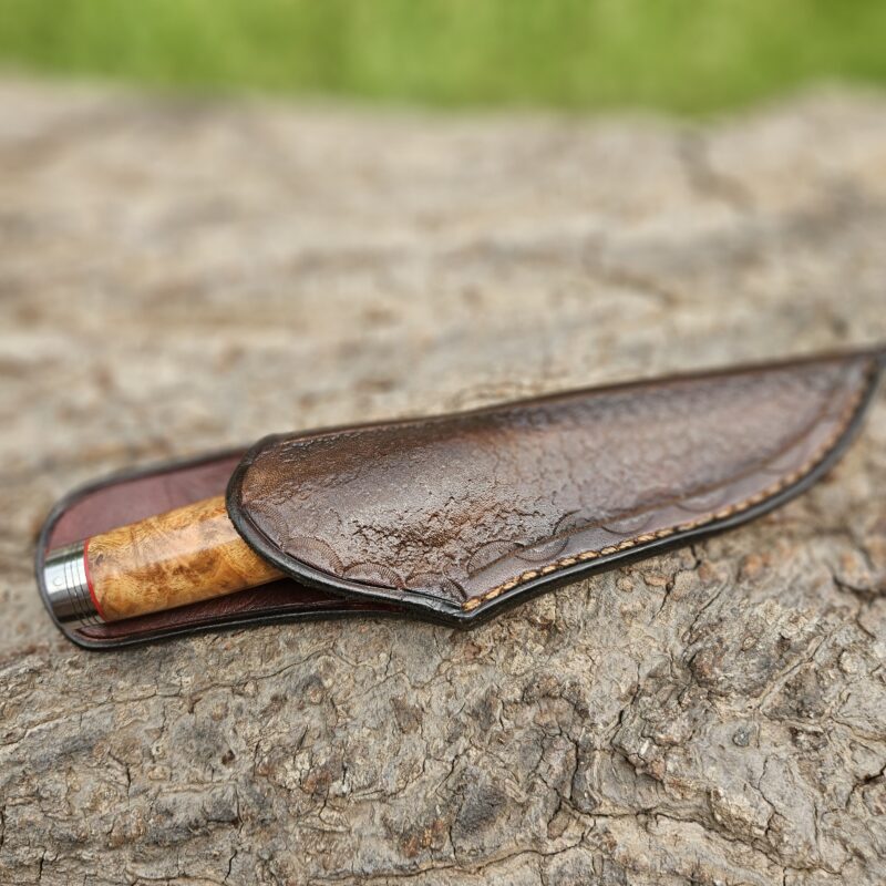 Faca de caça, aço inox 14C 28N. Dimensões: comprimento total = 25 cm; lâmina = 12,5 cm; largura = 3,5 cm; espessura = 4 mm. Empunhadura de ébano com inserto de chifre de cervo; guarda e pomo de inox com separadores de latão; passador de fiel na ponta da espiga; bainha de couro bovino tingido.