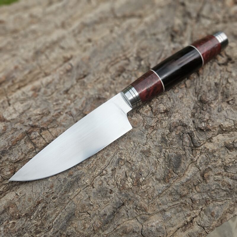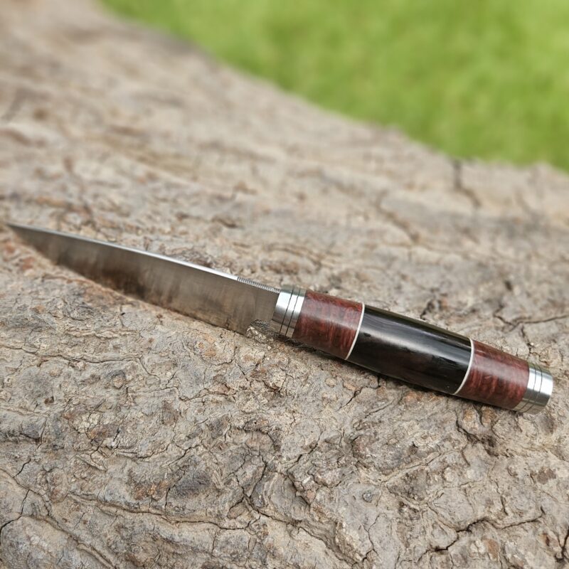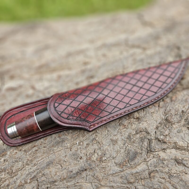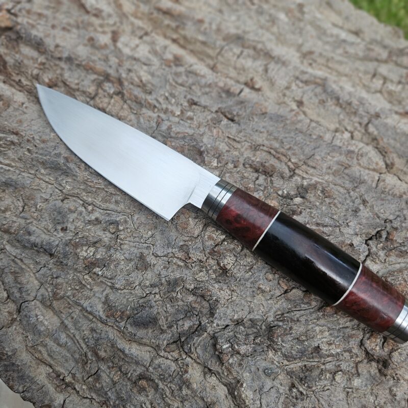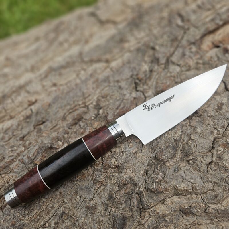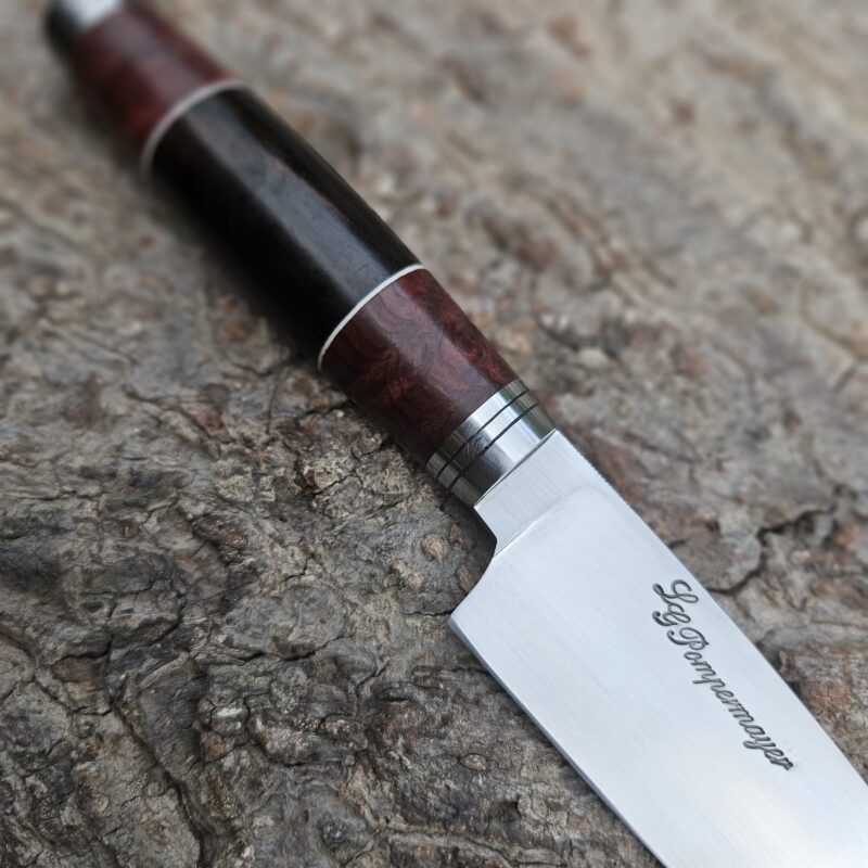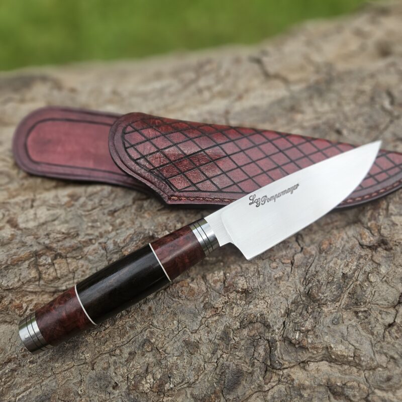 Faca utilitária, aço inox 1.4116. Dimensões: comprimento total = 24 cm; lâmina = 12,5 cm; largura = 3,3 cm; espessura = 2,5 mm. Empunhadura composta de madeira natural no centro (ébano) e madeira estabilizada nas extremidades (redwood burl), colarinho e pomo de inox, separadores de fibra vulcanizada e bainha de couro bovino tingido.