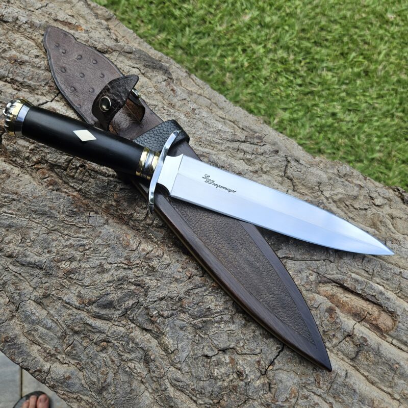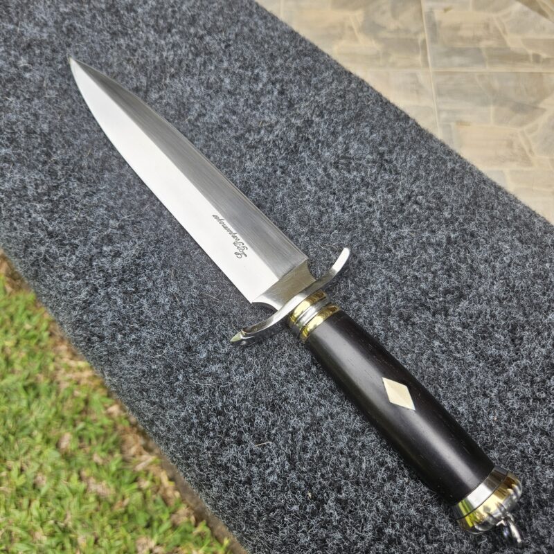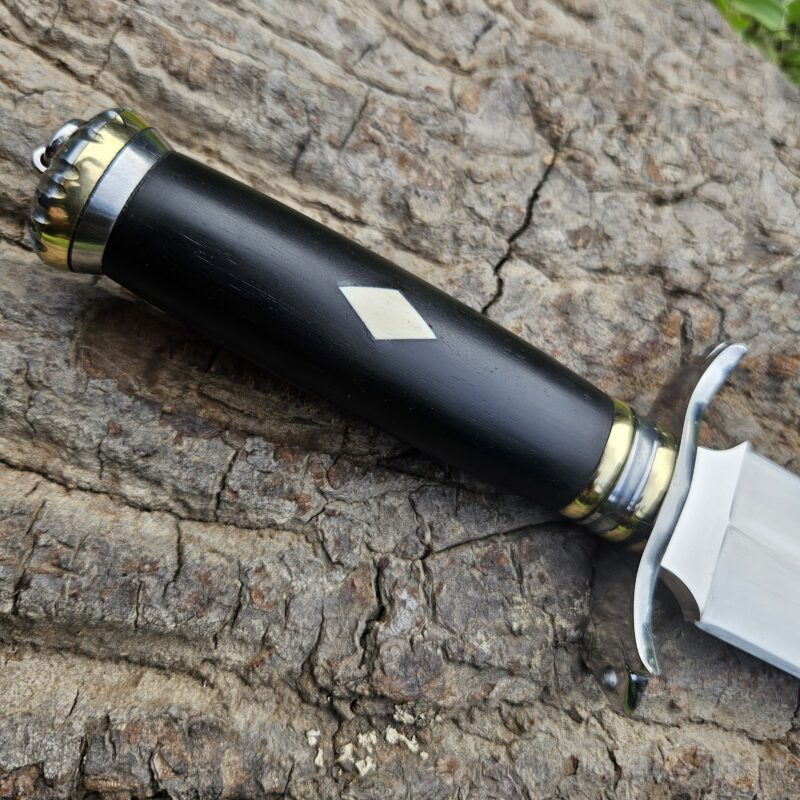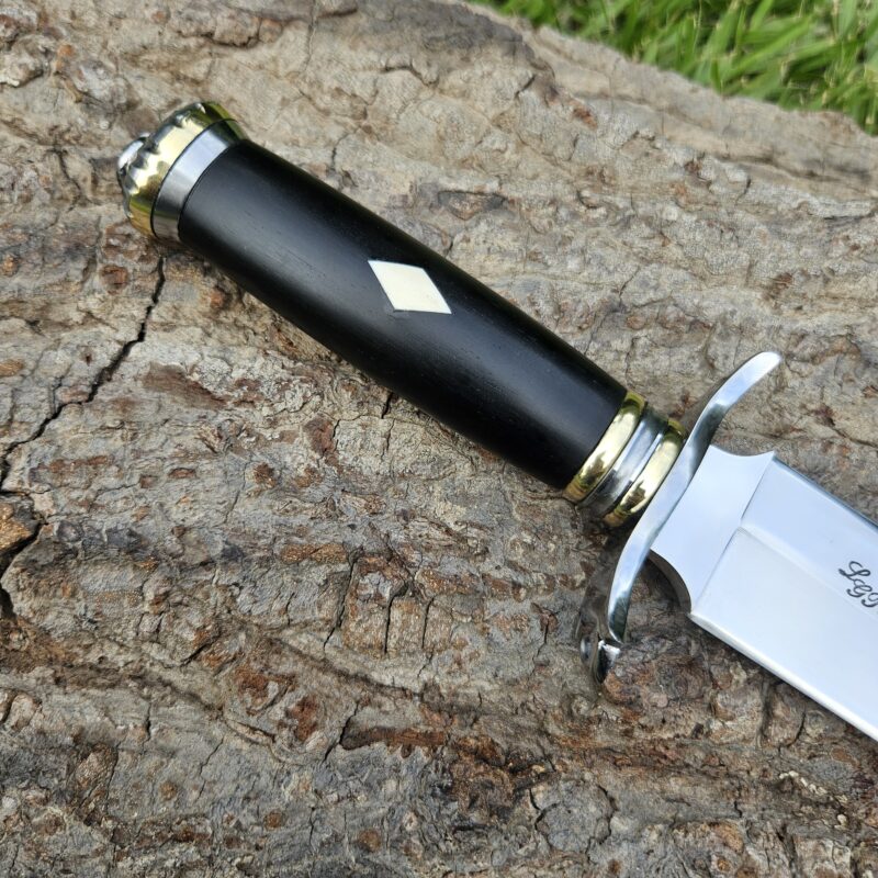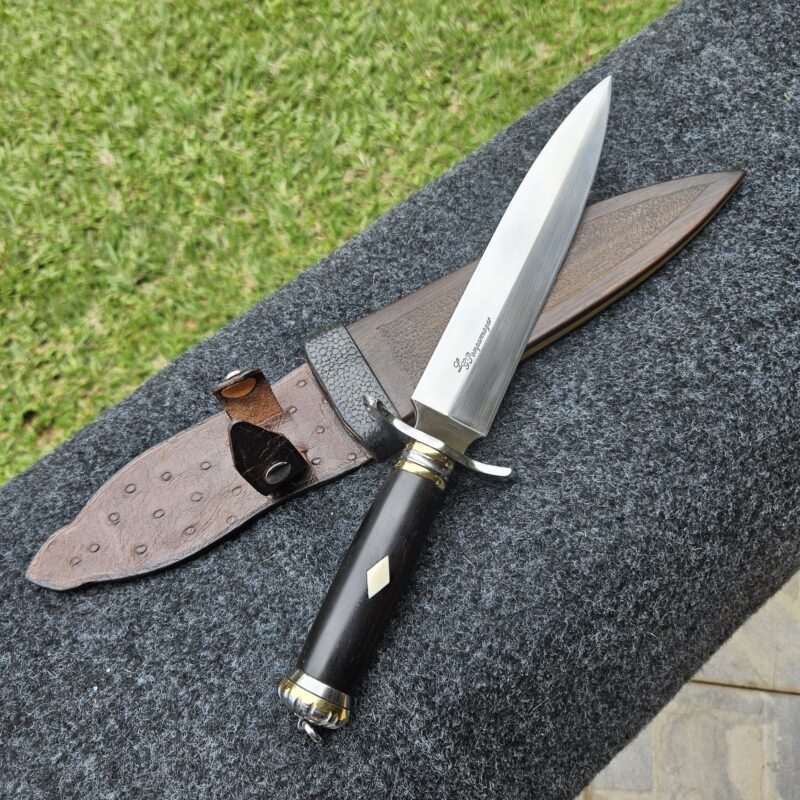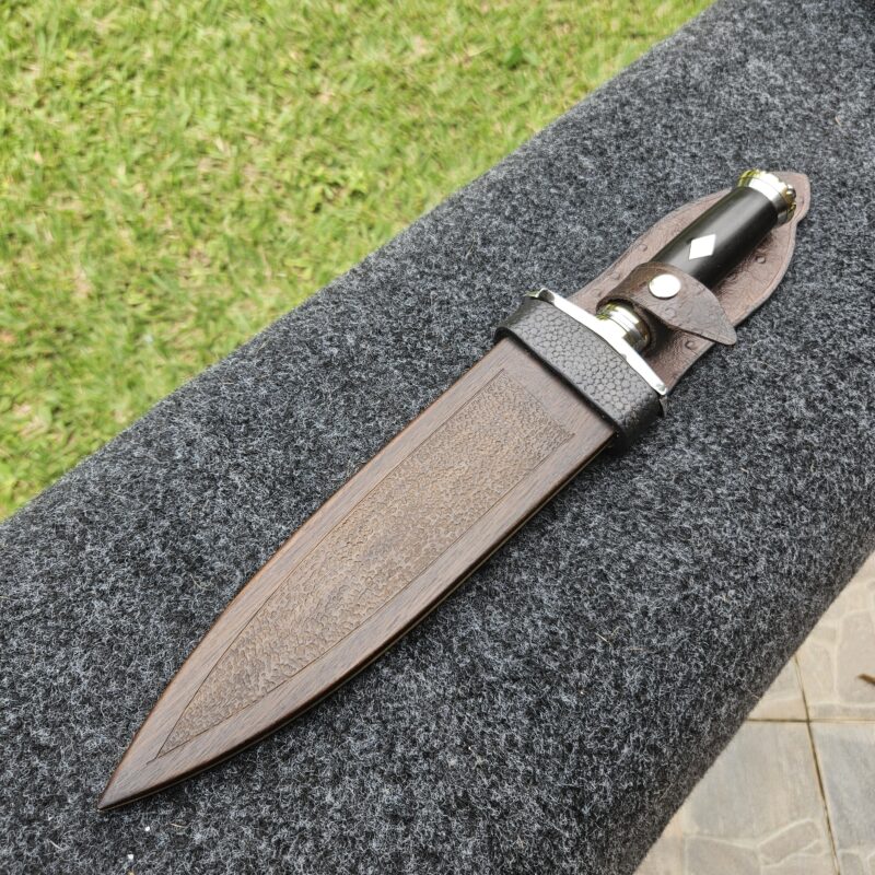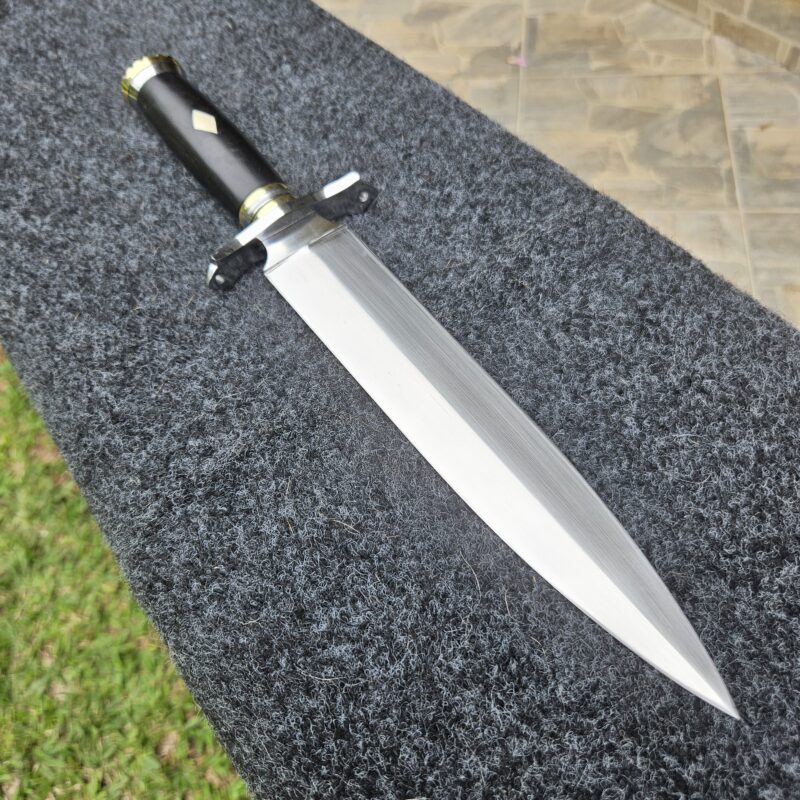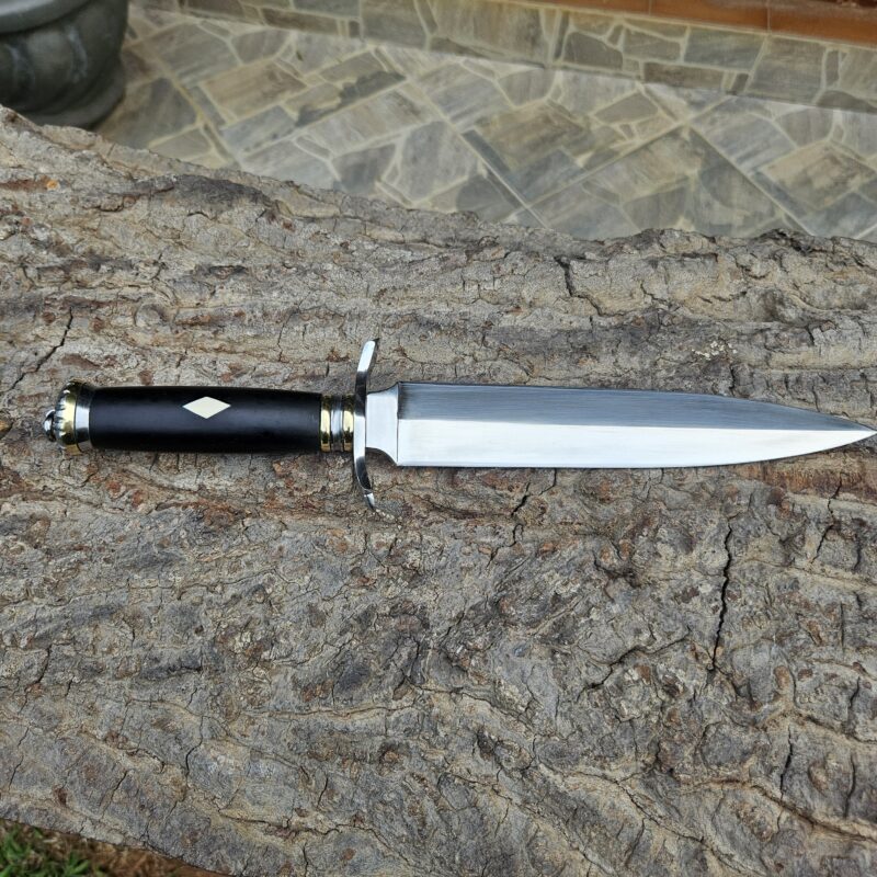 Adaga de aço inox N 690. Dimensões: comprimento total = 37 cm; lâmina = 23 cm; largura máxima = 4 cm; espessura = 5 mm. Empunhadura de ébano com inserto de osso. Guarda, colarinho e pomo de inox e latão. Bainha de braúna e ipê mulato.