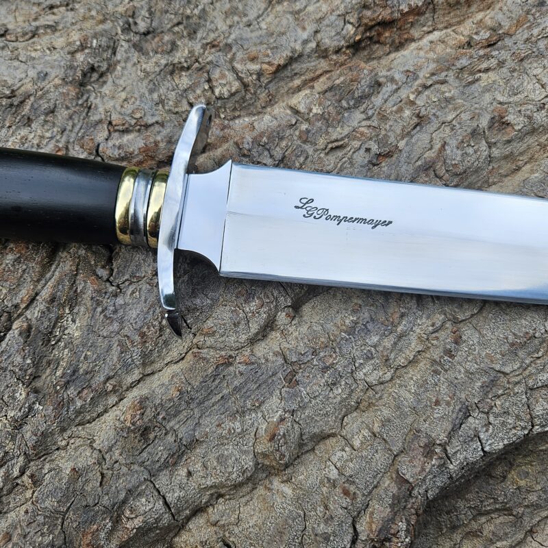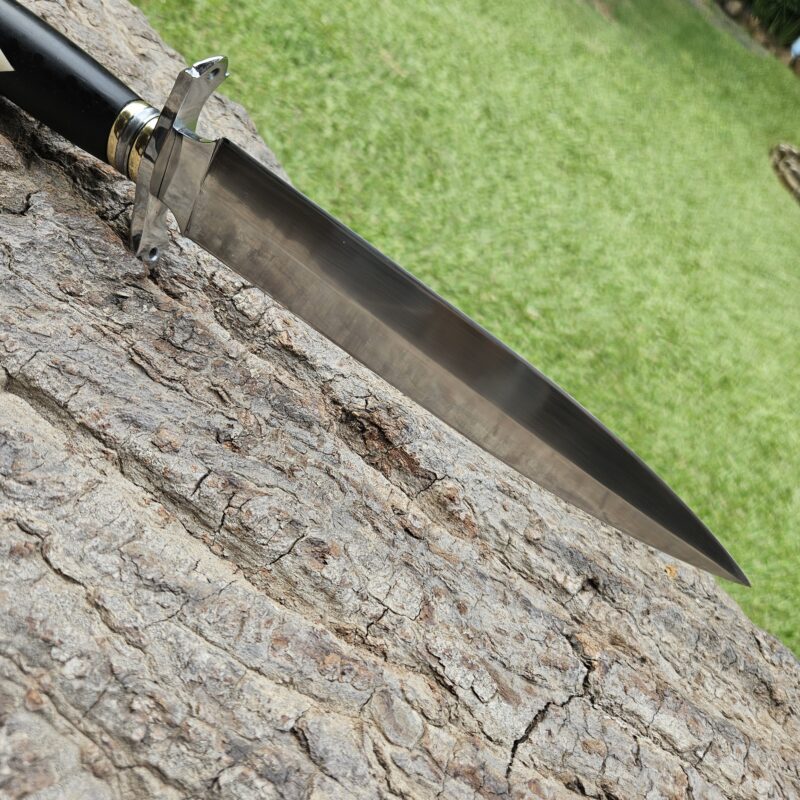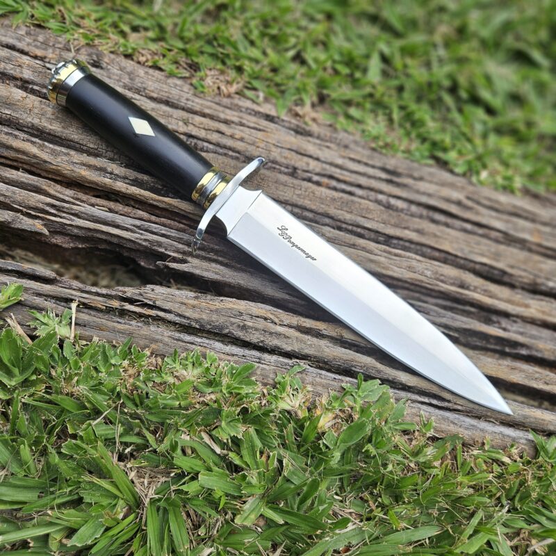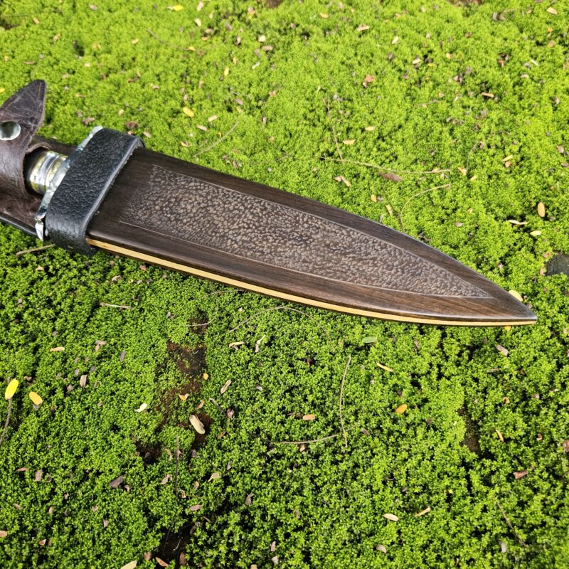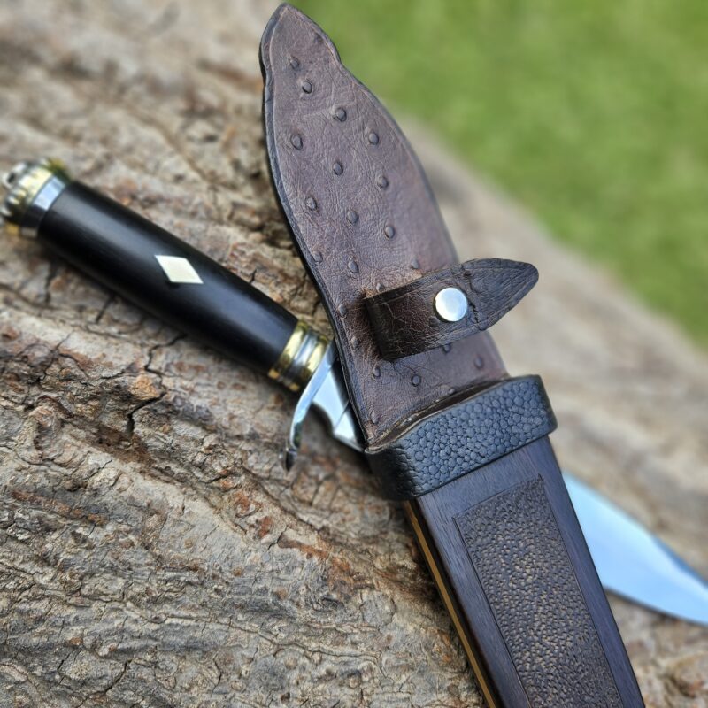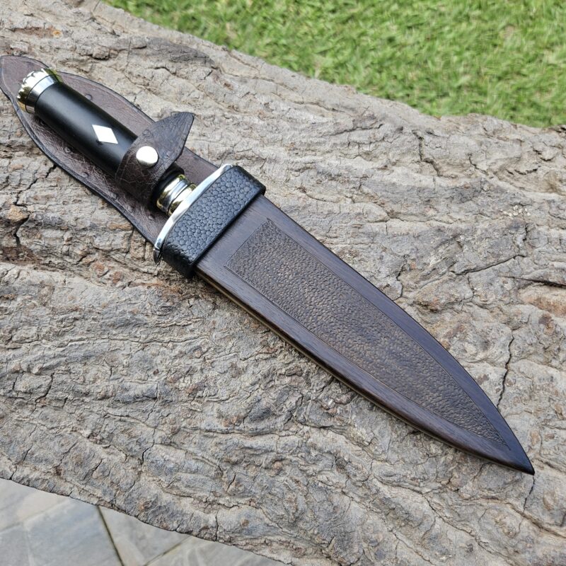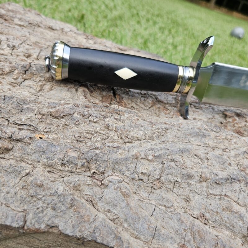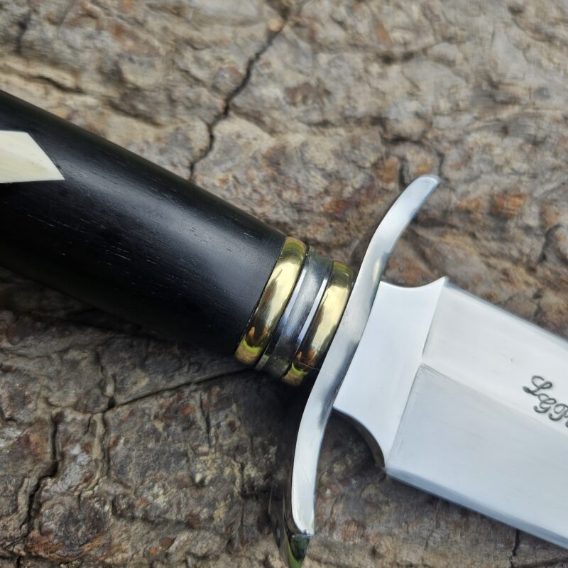Adaga de aço inox N 690. Dimensões: comprimento total = 37 cm; lâmina = 23 cm; largura máxima = 4 cm; espessura = 5 mm. Empunhadura de ébano com inserto de osso. Guarda, colarinho e pomo de inox e latão. Bainha de braúna e ipê mulato.